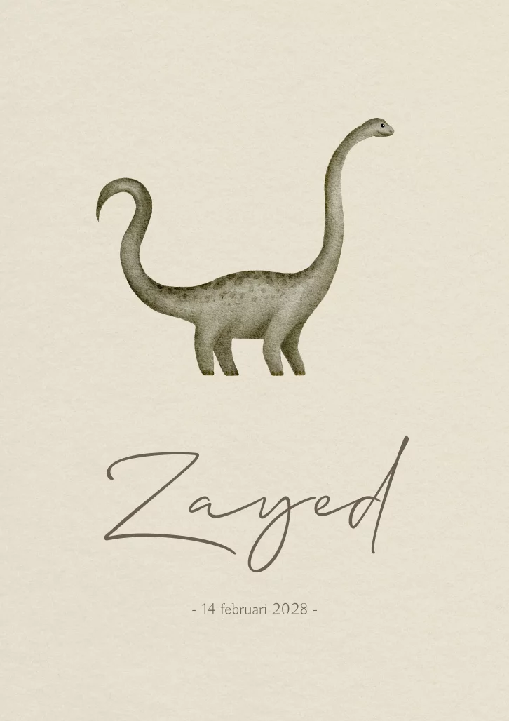 Een minimalistisch beige geboortekaartje met een illustratie van een diplodocus / apatosaurus dinoaurus. De tekening op kaartje Zayed is in watercolor/waterverf stijl getekend. Je past de kaart eenvoudig aan naar je eigen wensen.