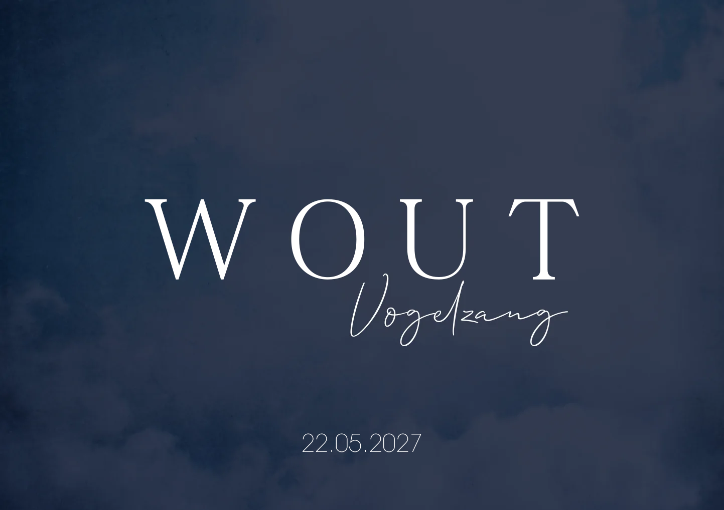 Supermooi en strak donkerblauw gewolkt geboortekaartje Wout met chique letters in goudfolie en sierlijke letters voor de achternaam. Pas de kaart aan naar jouw wensen en maak de kaart helemaal eigen in onze editor!
