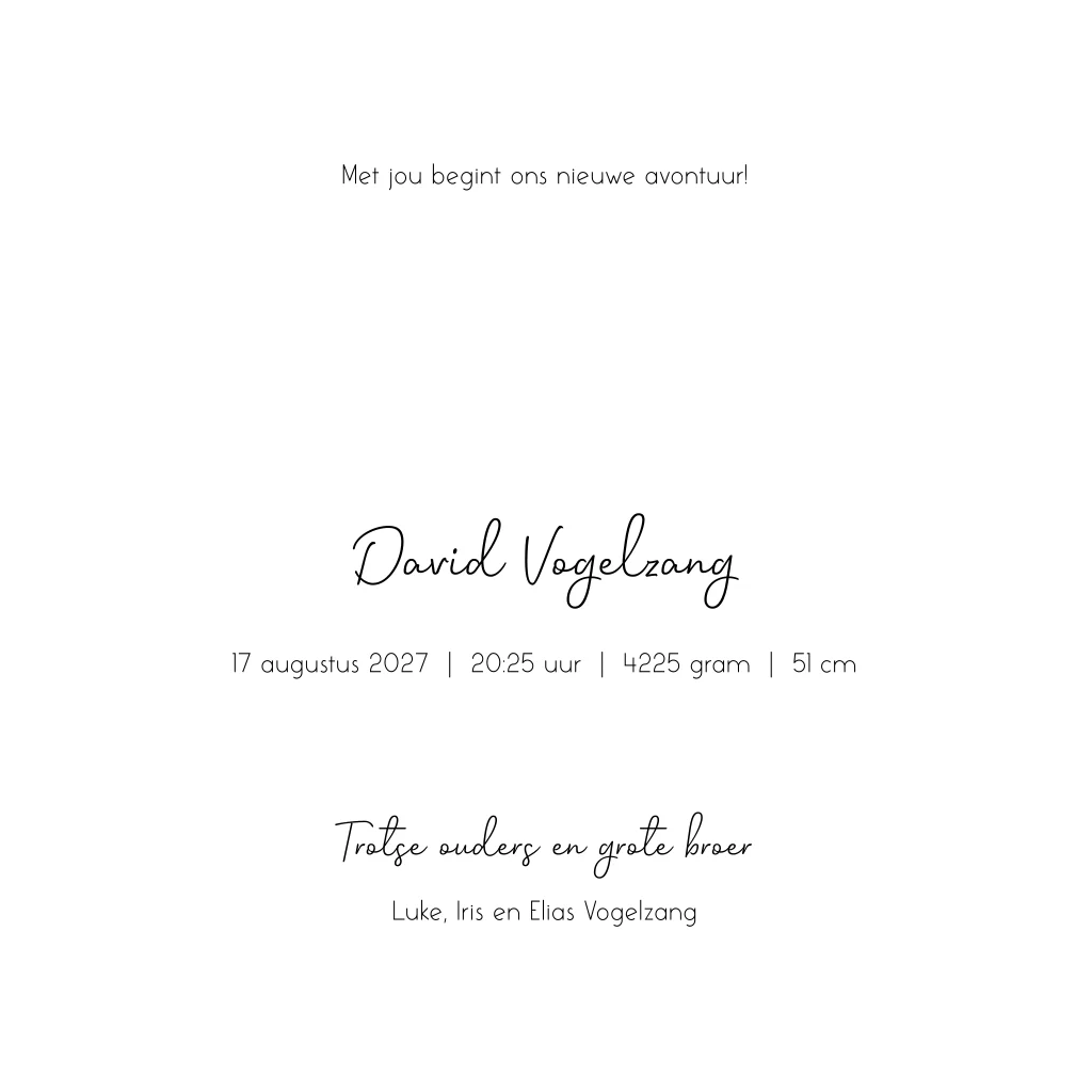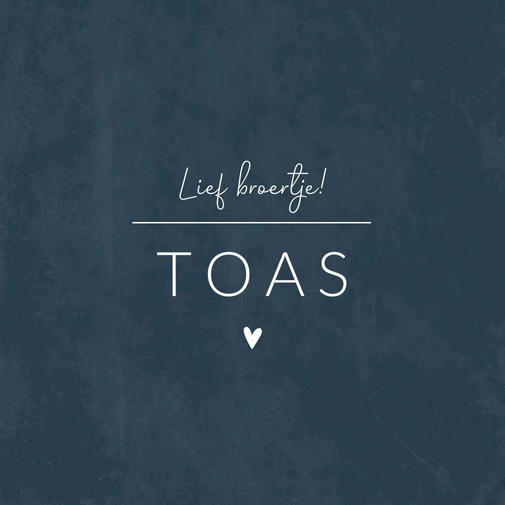 Donkerblauwe geboortekaart met gouden letters. In de binnenkant van geboortekaartje Toas zie je een illustratie van twee broertjes in een bakfiets. Deze illustratie kan je aanpassen naar je eigen gezinssamenstelling. Liever zonder illustratie? Verwijder hem dan.