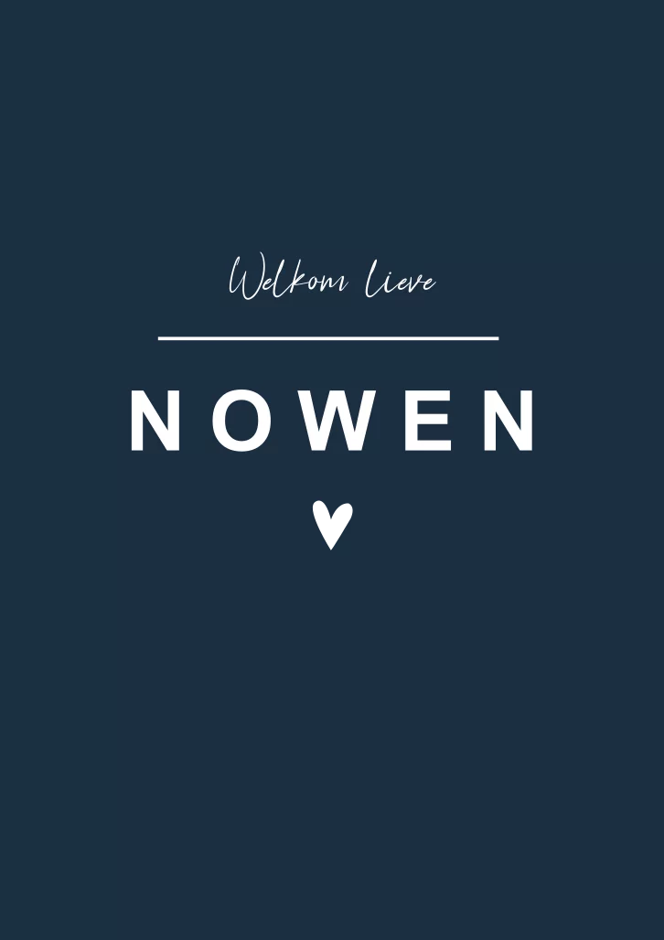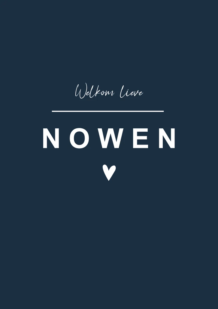 Stoere donkerblauwe geboortekaart Nowen met witte letters en koperfolie als afwerking. Het hartje kun je aanpassen naar een andere vorm als je dat wilt en zo zijn ook de kleuren van de kaart en de lettertypes aanpasbaar in onze editor.