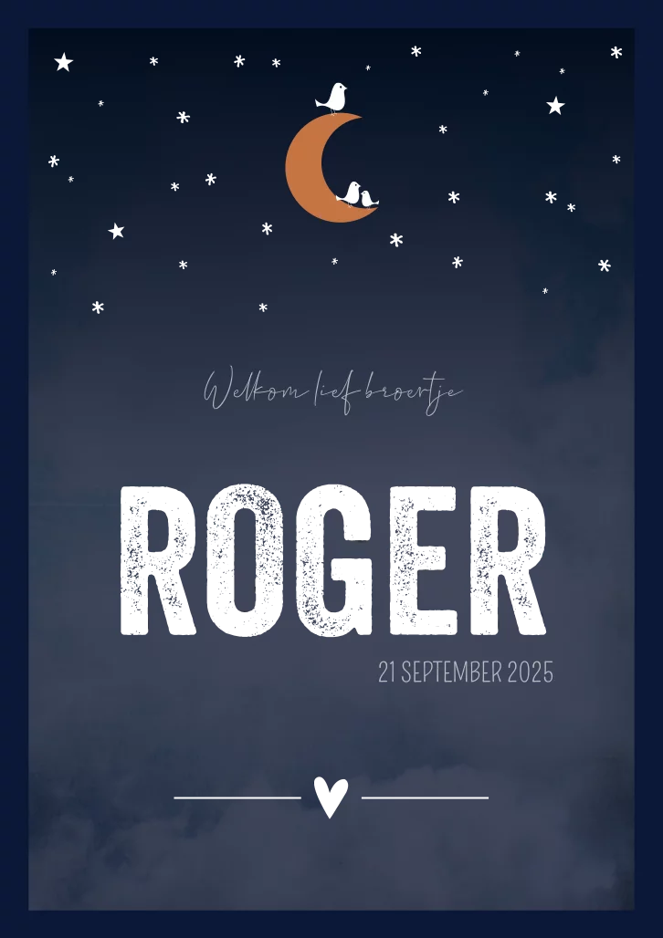 Een stoer donkerblauw gewolkt geboortekaartje met koperen sterretjes en naam. Het kaartje heeft een donkergroene omranding. Bij het kaartje Roger staan 3 vogeltjes op de maan, symbool voor papa, mama en kindje of 3 broertjes/zusjes. Wil je kaartje Loek aanpassen naar jouw wensen? Pas het kaartje dan gemakkelijk zelf aan in onze editor!