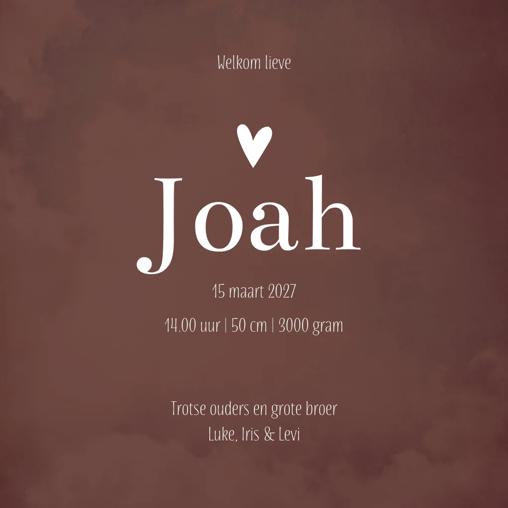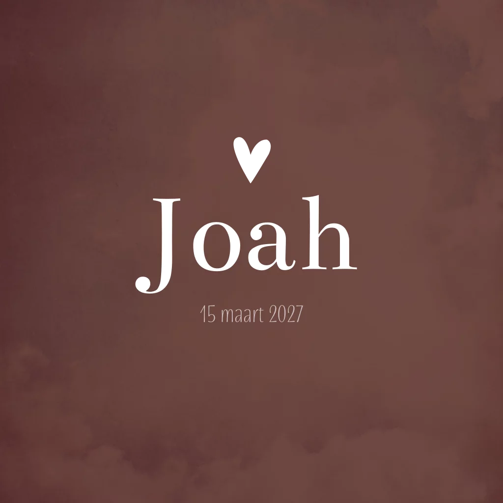 Stoer donkerbruin gewolkt babykaartje. Geboortekaartje Joah heeft witte letters en een gouden hartje. De gewolkte achtergrond geeft de kaart een romantische uitstraling. Pas de teksten gemakkelijk aan in de editor.