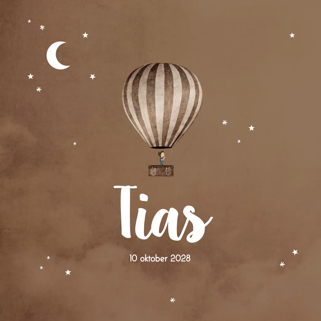 Een romantisch donker bruin geboortekaartje met daarop een jongetje dat in een luchtballon vaart in watercolor stijl. Op kaartje Tias staan sterretjes en maantjes die afgedrukt kunnen worden met goudfolie.