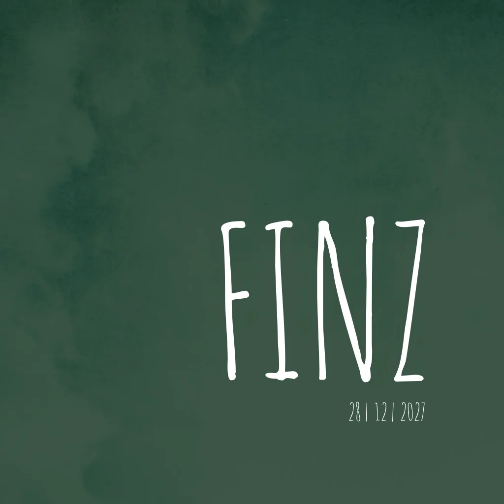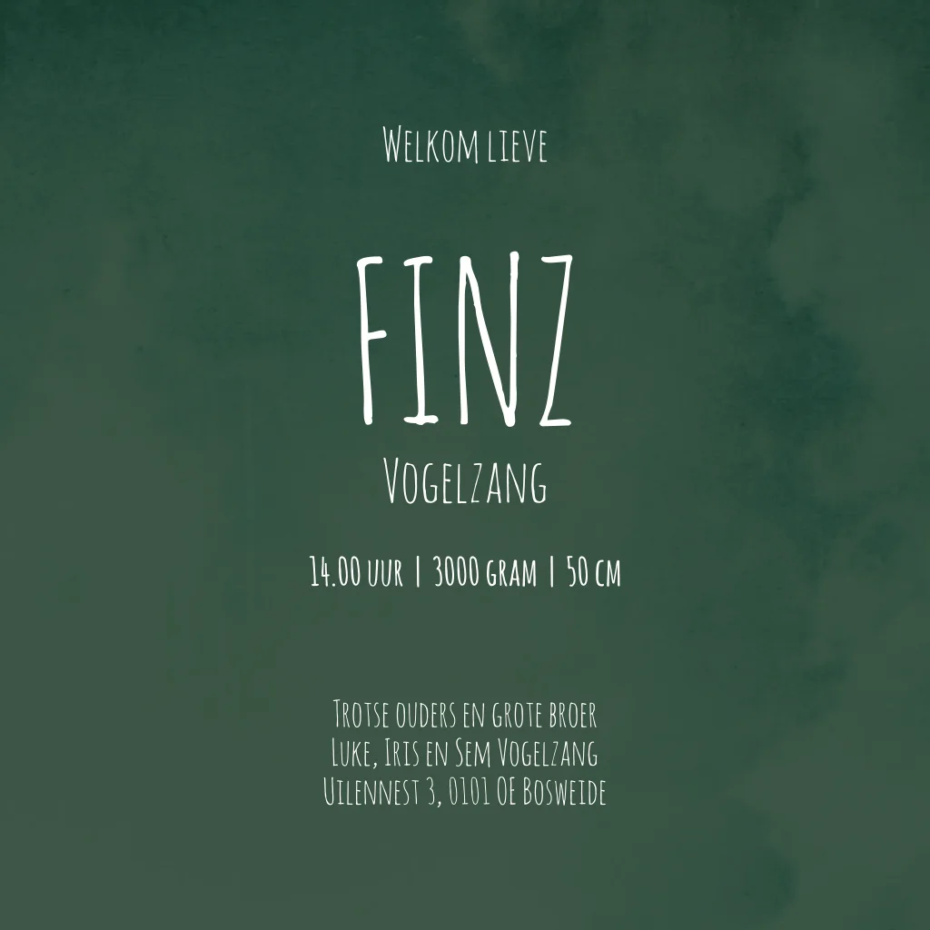Stoer donkergroen gewolkt geboortekaartje Finz met witte letters en aan de binnenzijde donkergroene hartjes als klein detail. Alle kleuren van dit baby kaartje zijn aanpasbaar, zo ook de opmaak en de afbeeldingen.