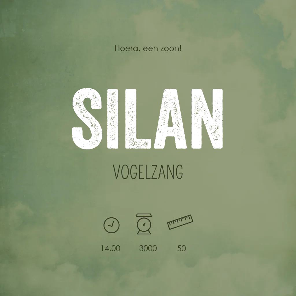 Een donkergroen stoere geboortekaart met een giraffen familie voor een jongen. Deze kaart Silan kun je gemakkelijk en snel aanpassen qua kleur, opmaak en tekst. Zo maak je de kaart binnen enkele minuten helemaal naar je eigen smaak. Vervolgens kun je er een proefdruk van laten maken, dan kun je hem thuis even voelen en bekijken!
