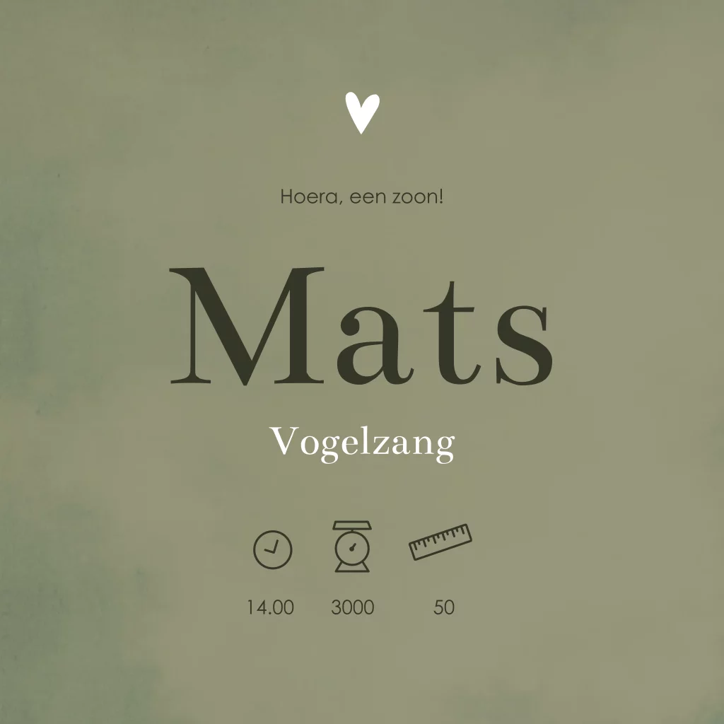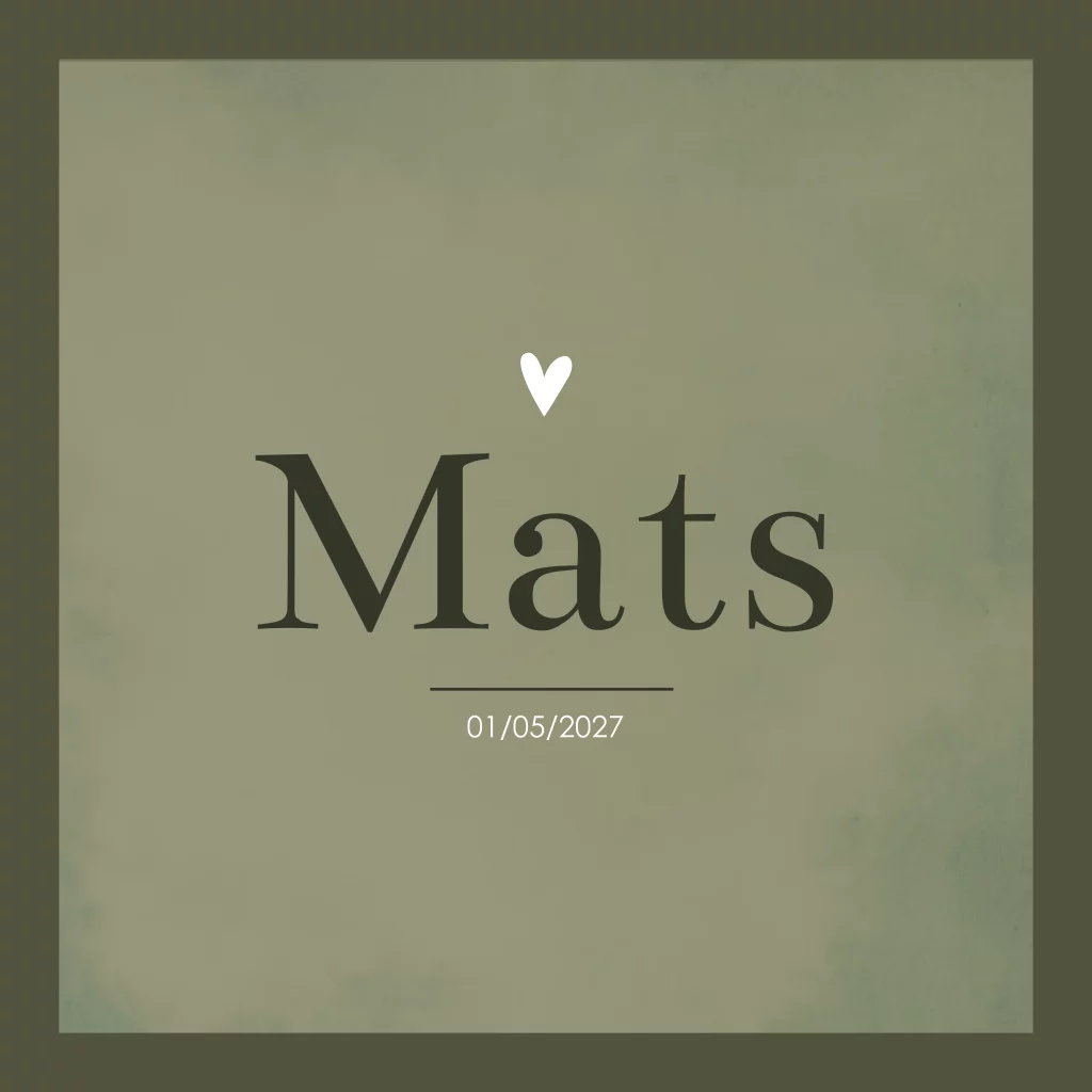Een donkergroen stoere geboortekaart voor een jongen. Deze kaart Mats kun je gemakkelijk en snel aanpassen qua kleur, opmaak en tekst. Zo maak je de kaart binnen enkele minuten helemaal naar je eigen smaak. Vervolgens kun je er een proefdruk van laten maken, dan kun je hem thuis even voelen en bekijken!