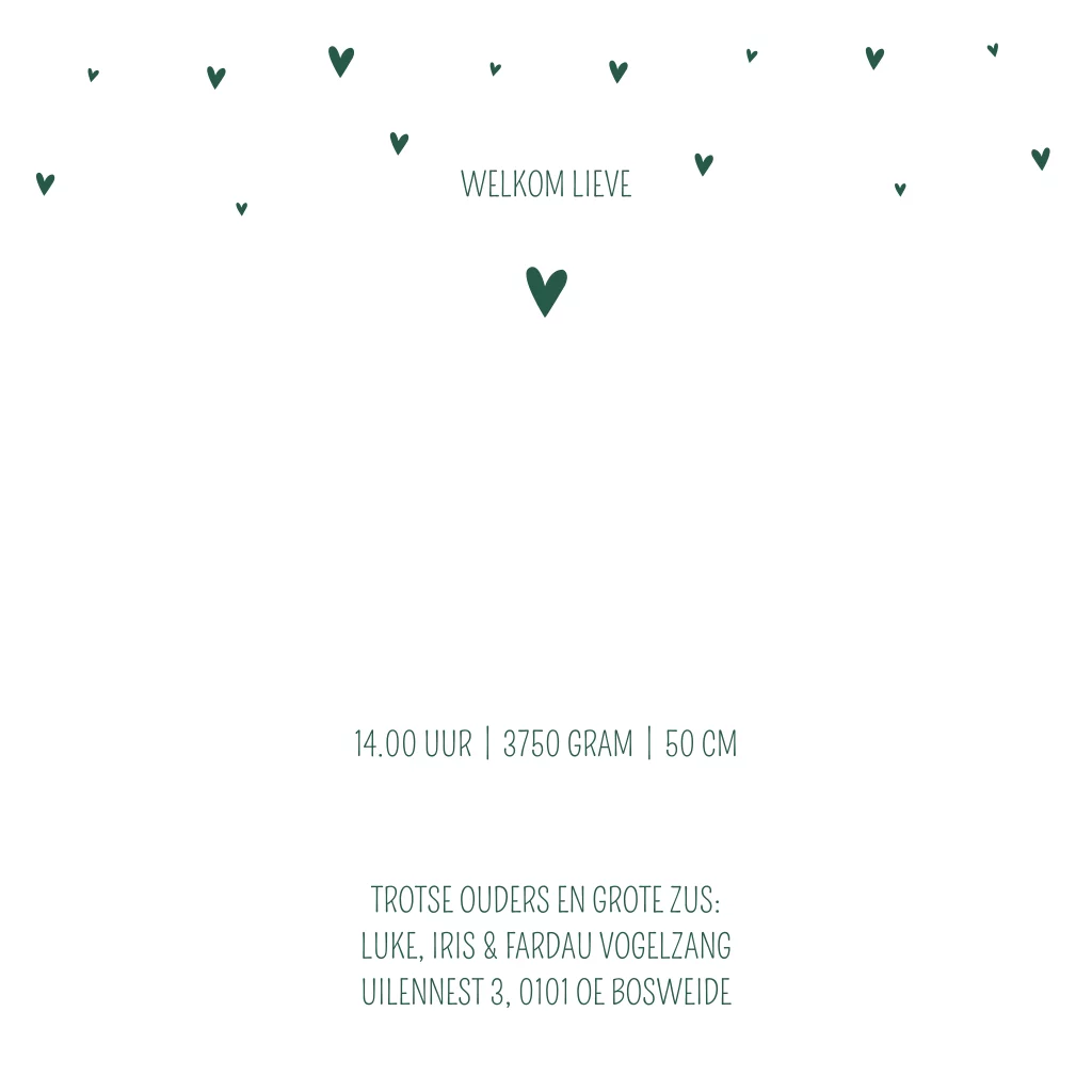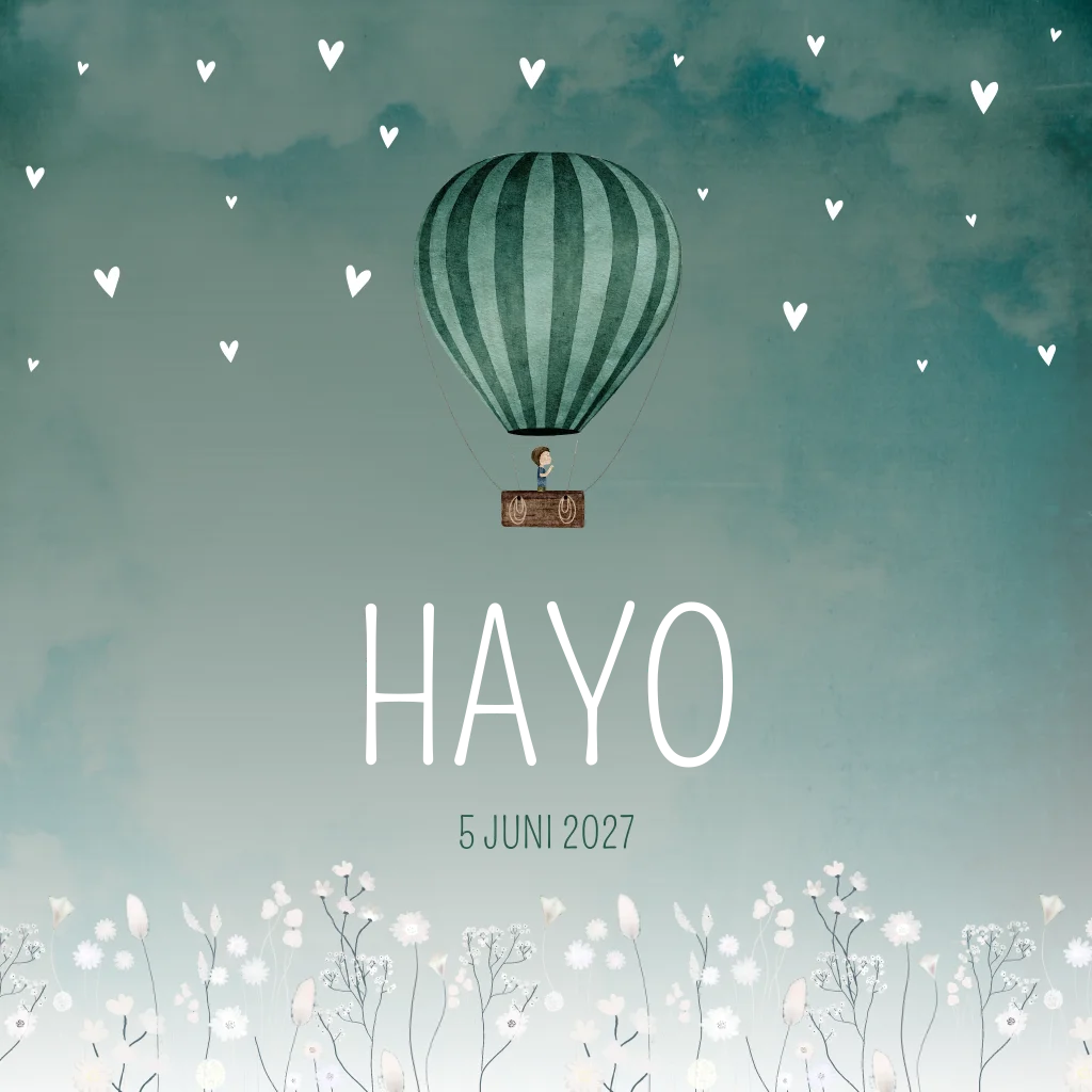 Een lief geboortekaartje met een getekend bloemenveld van droogbloemen en een jongetje in een luchtballon. Kaartje Hayo is door de groenige kleur lief maar ook heel stoer. Het zilverfolie op de babykaart maakt de kaart helemaal af!