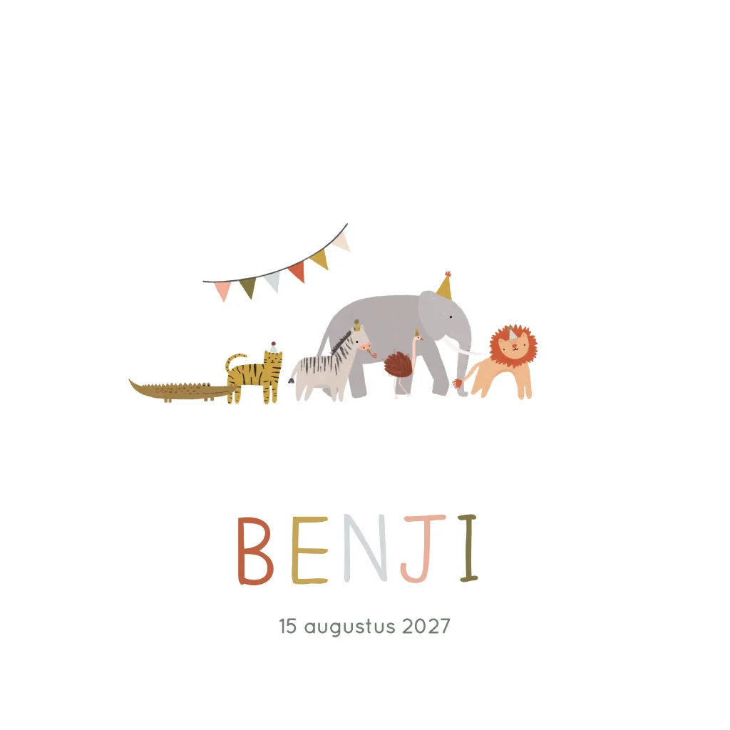 Party Animals! Natuurlijk is het een feestje met een kleine erbij! Dit schattige vrolijke geboortekaartje heeft een dierenparade op de voorzijde met feesthoedjes en een slinger. De letters van de naam op kaartje Benji staan in verschillende kleuren om het kaartje nog vrolijker te maken. Wil je graag iets aanpassen? Dat kan! Alle elementen zijn aanpasbaar.