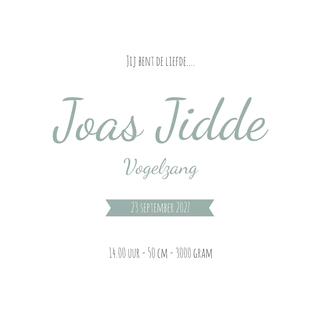 Een lief fotokaartje met speelse accenten. Door de zacht groen hartjes en vaantjes wordt het kaartje wat speelser. Kaartje Joas is door de zachte kleuren erg rustig.