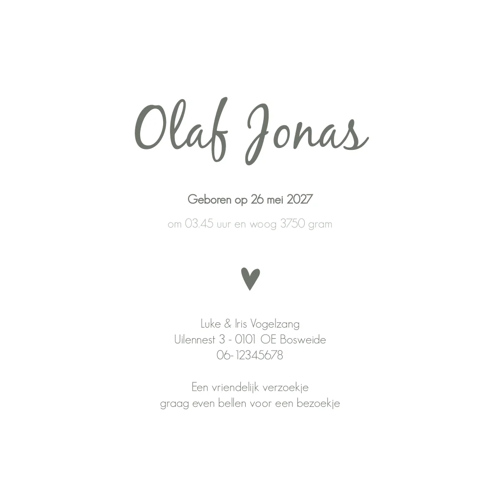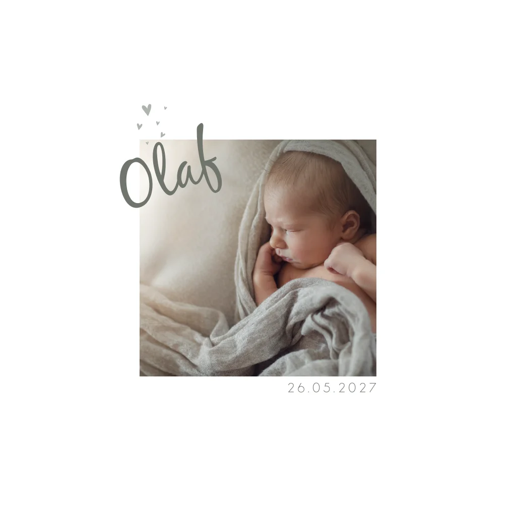Een neutraal geboortekaartje met hartjes en ruimte voor een foto. Kaartje Olaf is de perfecte combinatie tussen lief en modern.