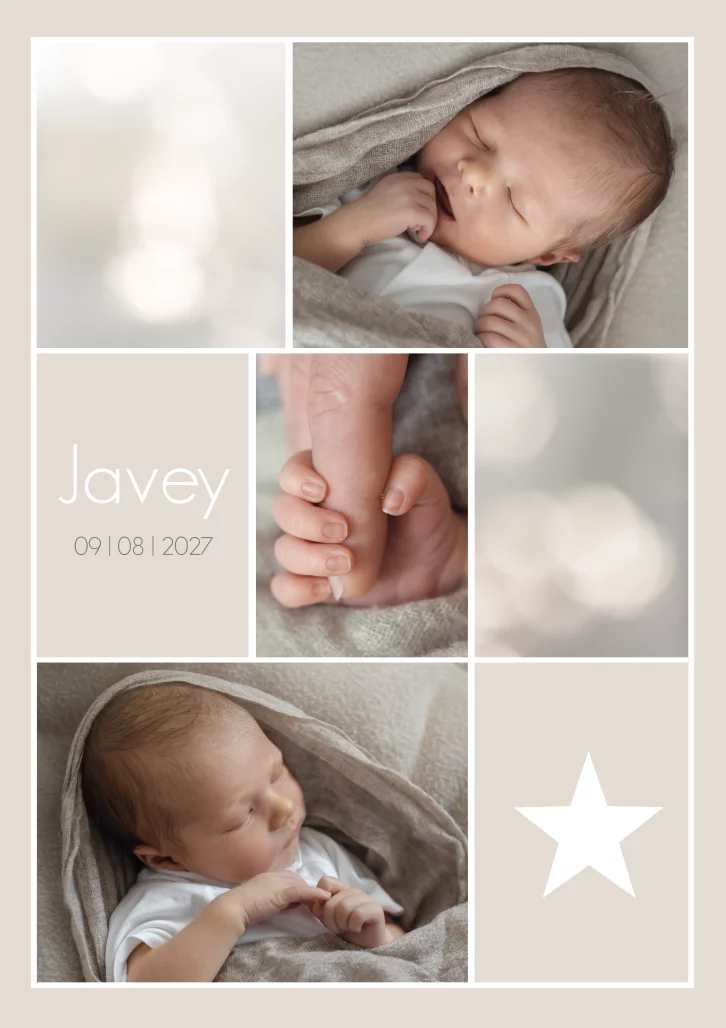 Een mooi strak geboortekaartje met ruimte voor veel foto's van de kleine jongen. De voorbeeldfoto's op het kaartje Javey zijn gemaakt door mooiklein.nl. Je kunt je eigen foto's uploaden en aan de kaart toevoegen. Vergeet niet de witte lijnen bovenop de kaart te leggen in de editor voor een mooie afwerking.