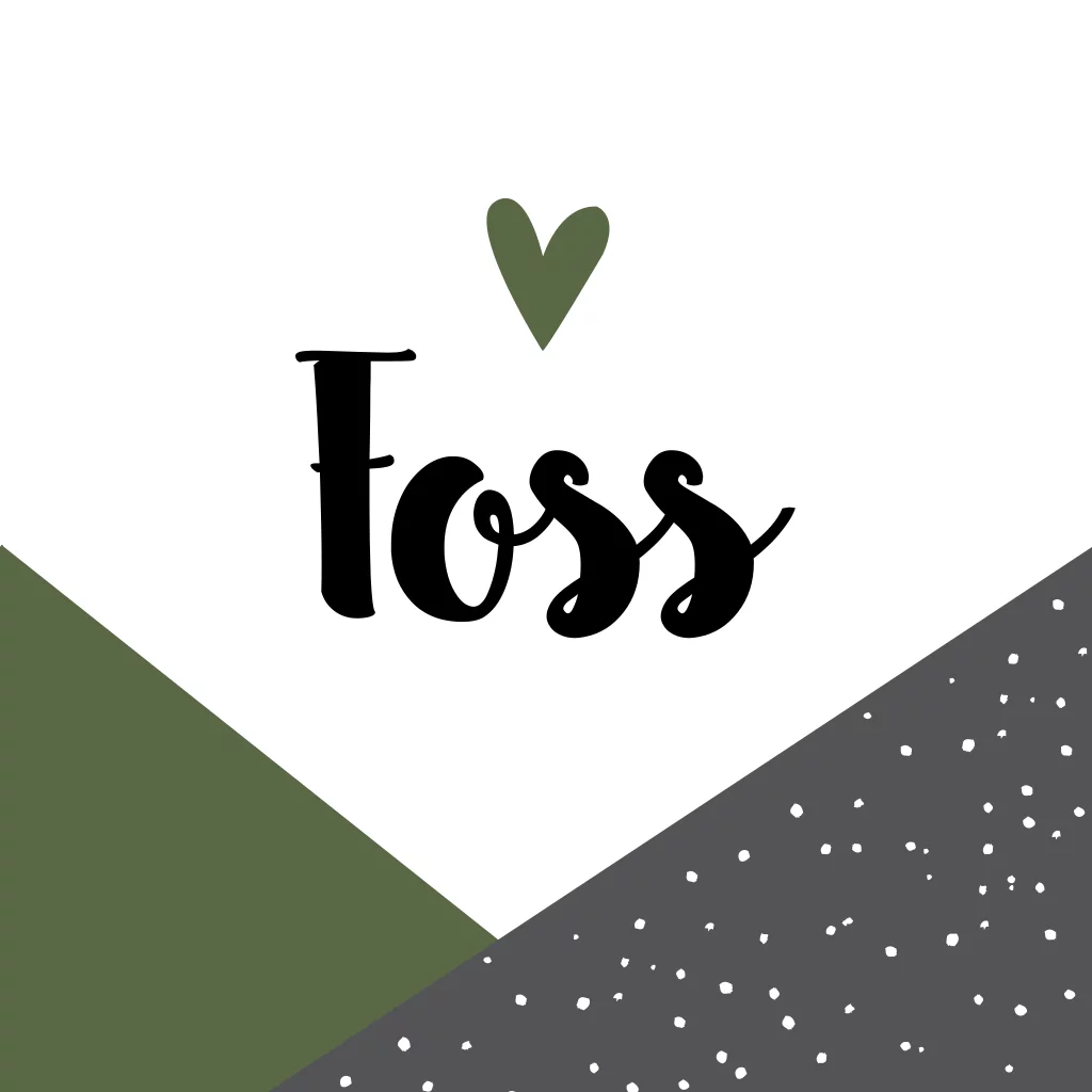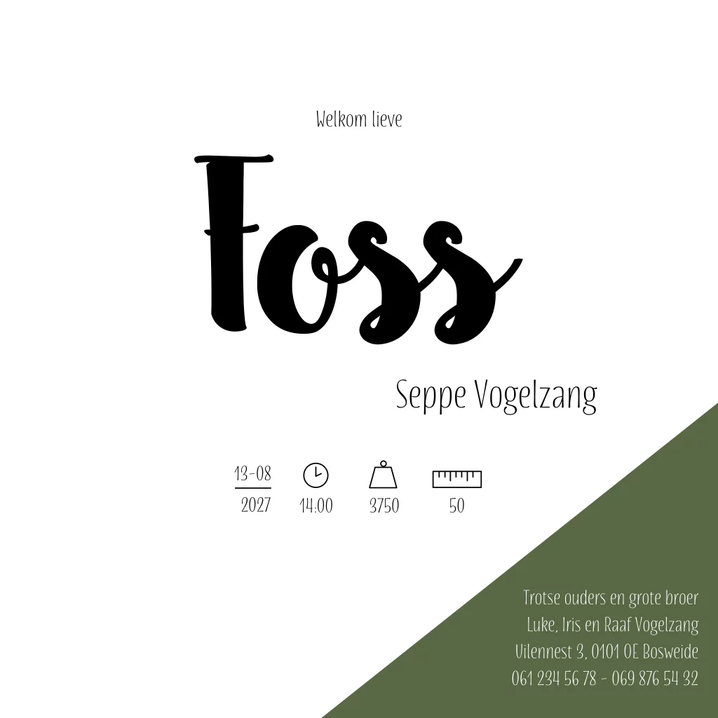 Een geboortekaartje met antraciet en groene kleurvlakken. Kaartje Foss is erg stoer maar door de stippen weer speels. Pas gemakkelijk zelf de kaart aan in onze editor.