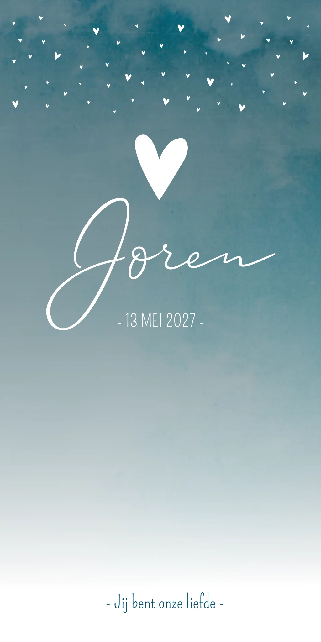 Een romantisch blauw geboortekaartje met hartjes en een kleurverloop. Kaartje Joren wordt nog mooier als je de grote hartjes met koperfolie laat bedrukken en/of een label toevoegt met een foto van de kleine.