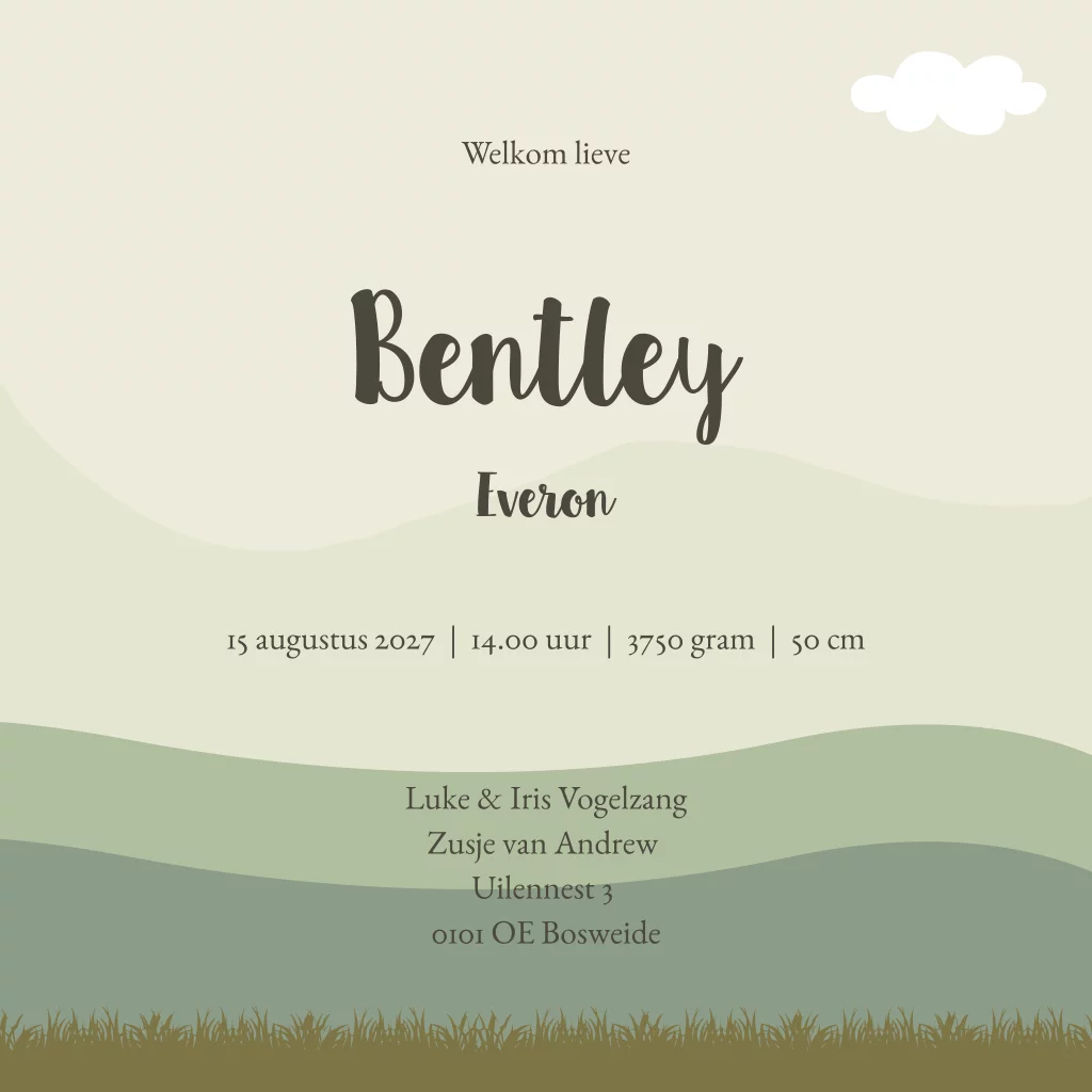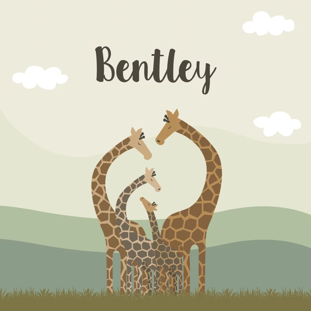 Een stoer, maar ook lief geboortekaartje met een familie van giraffen op de voorkant. Kaartje Bentley is geheel naar wens aan te passen zodat het matcht met jullie gezinssituatie.
