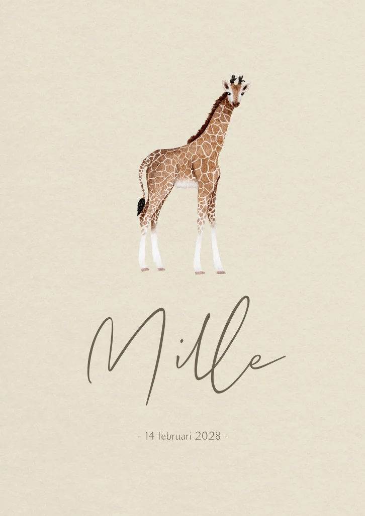 Een minimalistisch beige geboortekaartje met een illustratie van een giraffe. De tekening op kaartje Mille is in watercolor/waterverf stijl getekend. Je past de kaart eenvoudig aan naar je eigen wensen.