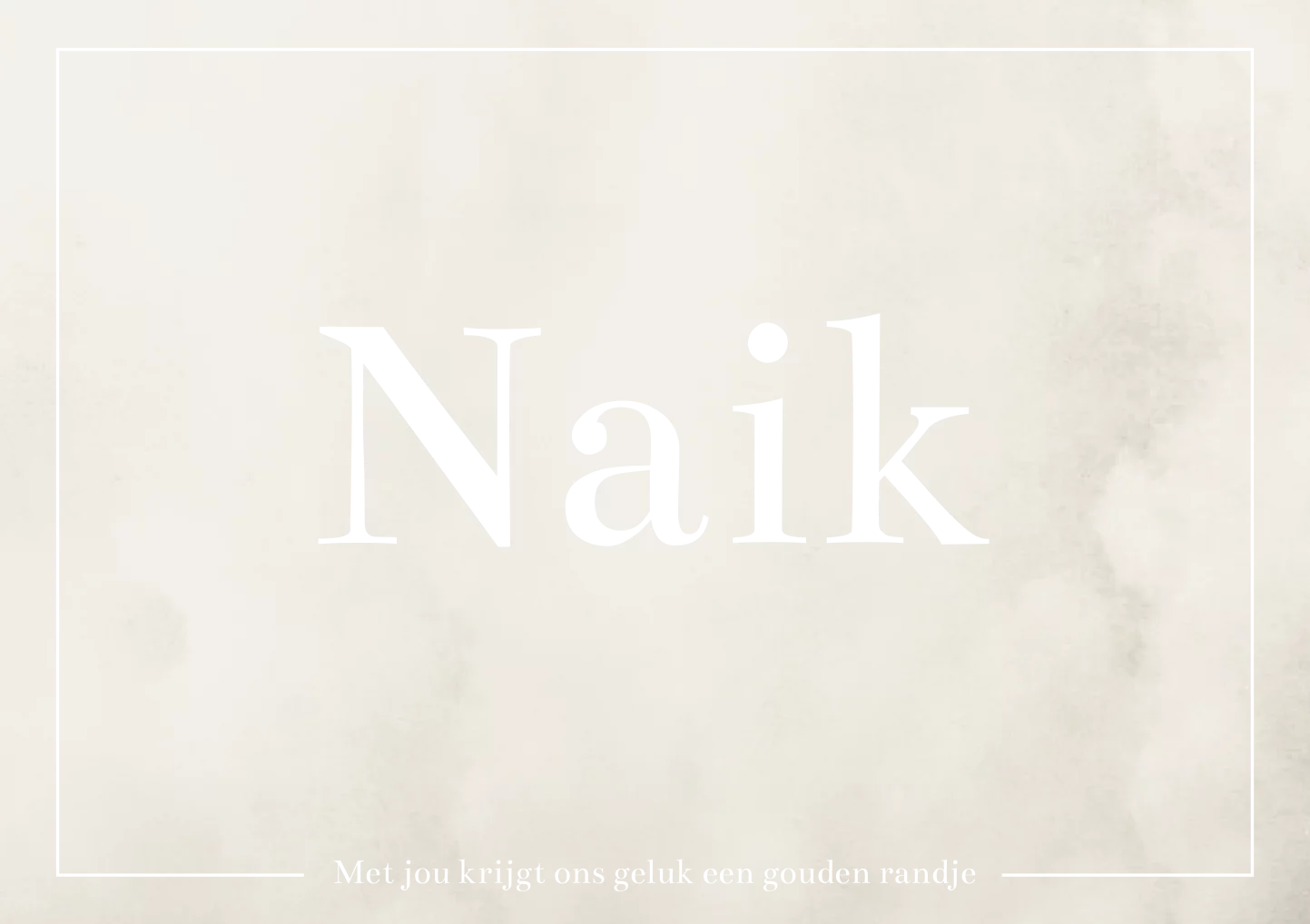 Stijlvolle beige gewolkte kaart in aquarel stijl met een gouden randje om de kaart en de toepasselijke tekst: Met jou krijgt ons geluk een gouden randje. Kaart Naik Sem is makkelijk aanpasbaar in onze editor, zodat het geheel past bij de stijl van jouw babykamer.