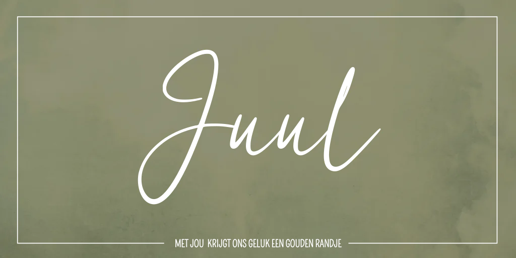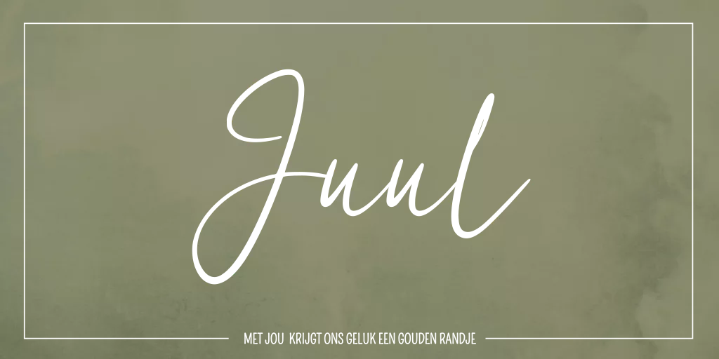 Stijlvolle groen gewolkte kaart in aquarel stijl met een gouden randje om de kaart en de toepasselijke tekst: Met jou krijgt ons geluk een gouden randje. Kaart Juul is makkelijk aanpasbaar in onze editor, zodat het geheel past bij de stijl van jouw babykamer.