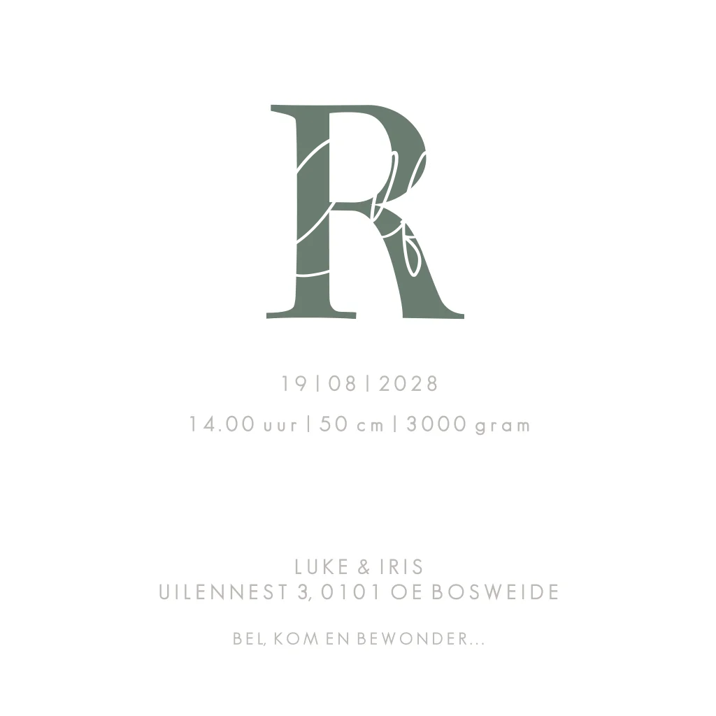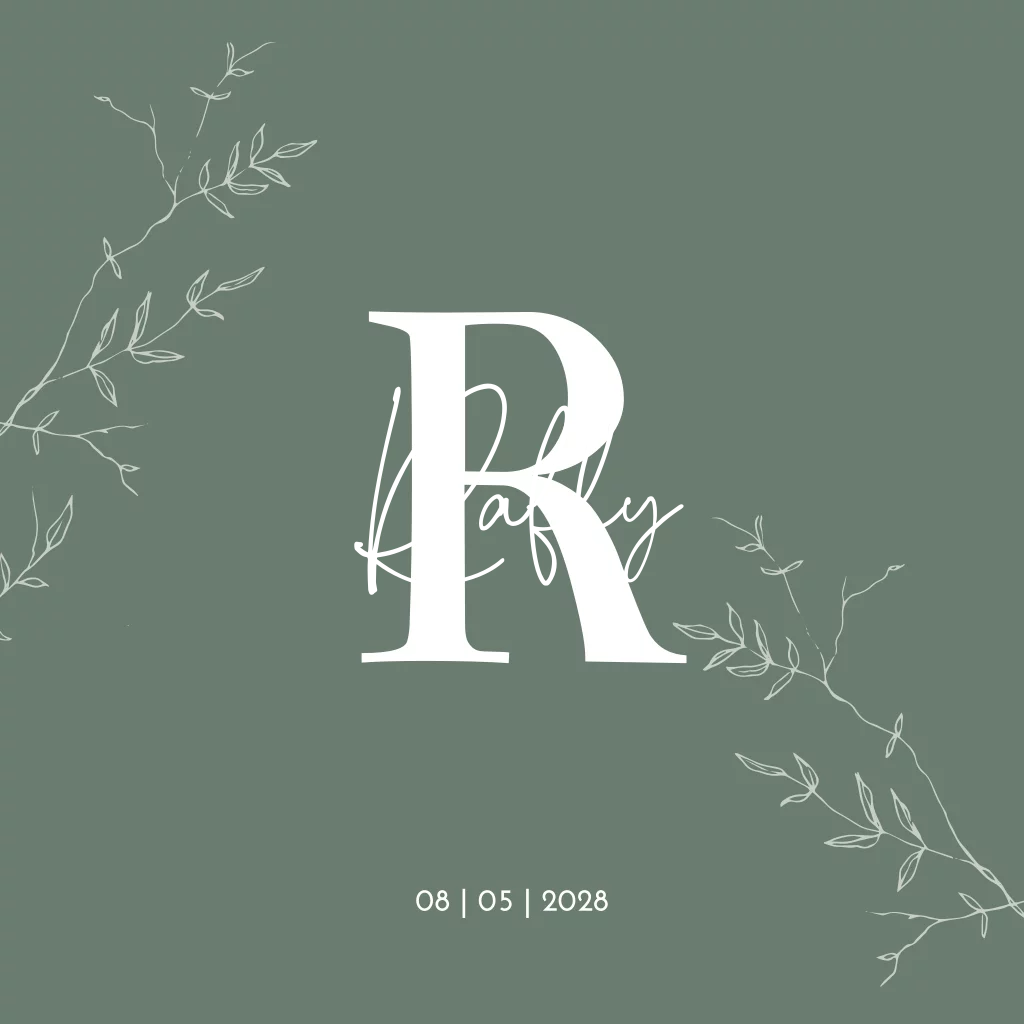 Een groen hip geboortekaartje met een witte letter als initiaal. De naam staat in een sierlijke handgeschreven letter in goudfolie. Kaartje Raffy is klassiek en tijdloos.