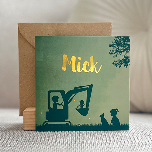 Een stoer groen geboortekaartje met een illustratie van twee broertjes in de graafmachine vergezeld door een hondje. Kaartje Jasper is afgewerkt met goudfolie zodat het nog specialer wordt. Wil je liever het kaartje zonder klein broertje of met een ander huisdier? Pas het kaartje gemakkelijk zelf aan in onze editor!