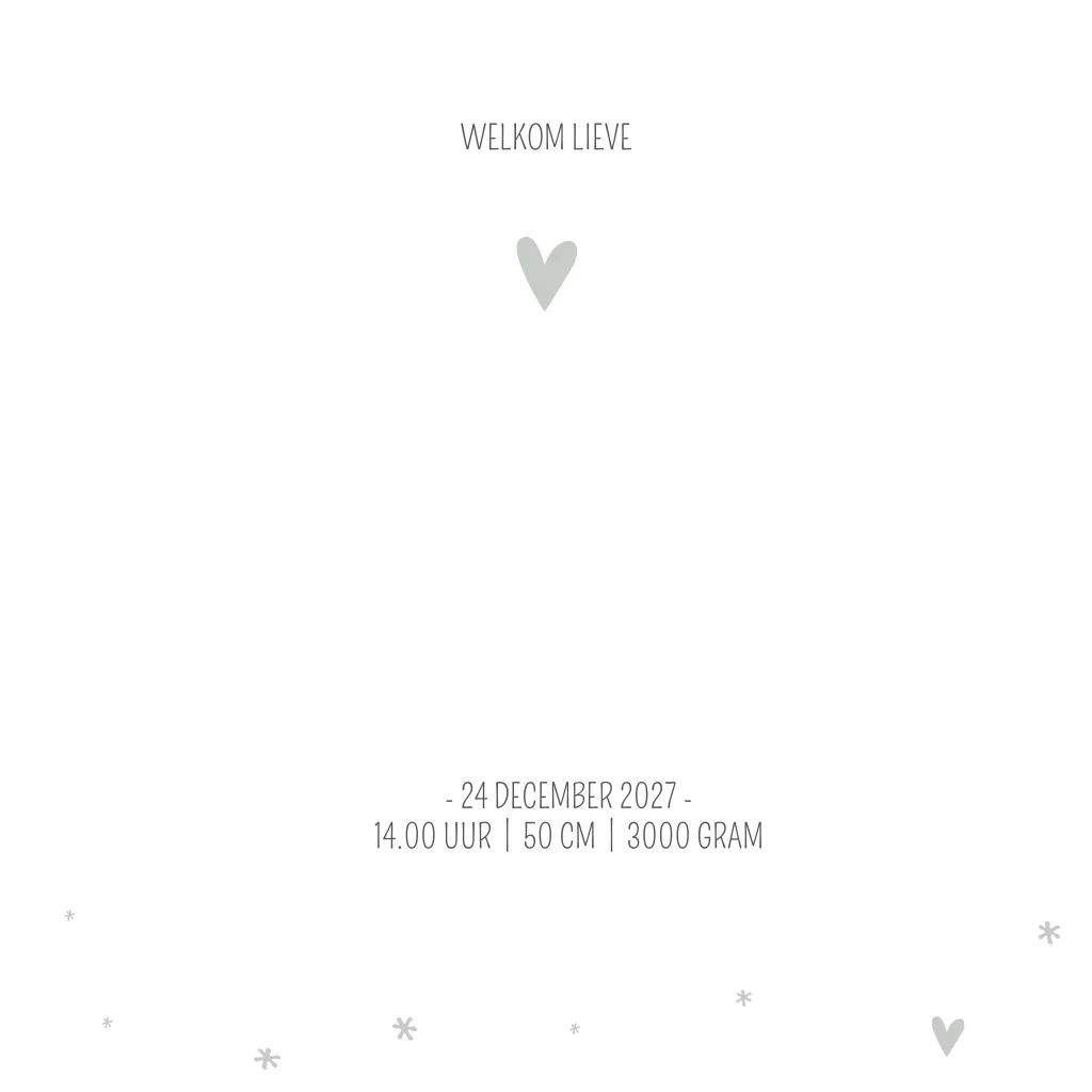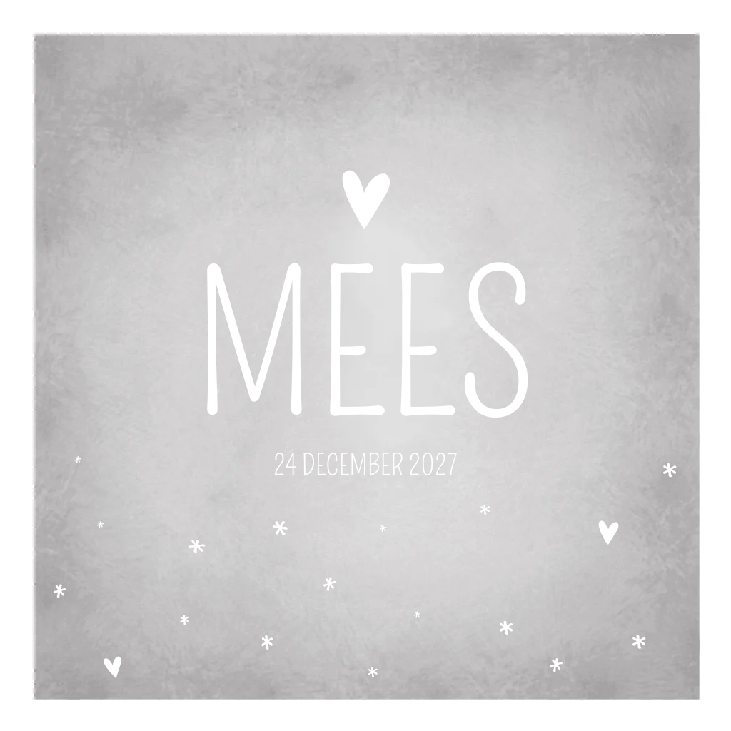Rustig grijs gewolkt geboorte kaartje met koperen details en grijze hartjes. De kleur maakt geboortekaartje Mees een stoer kaartje. De koperen hartjes geven de kaart een lieve touch.