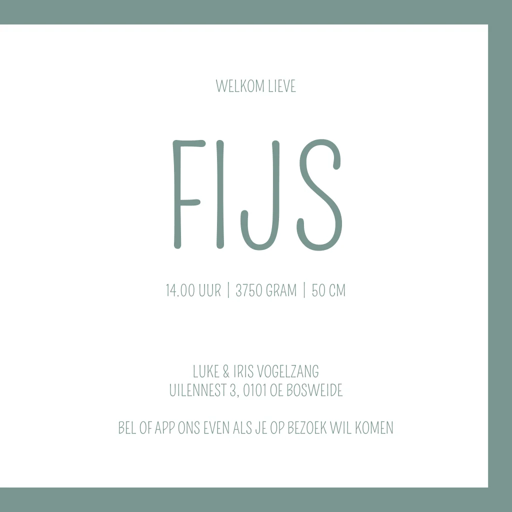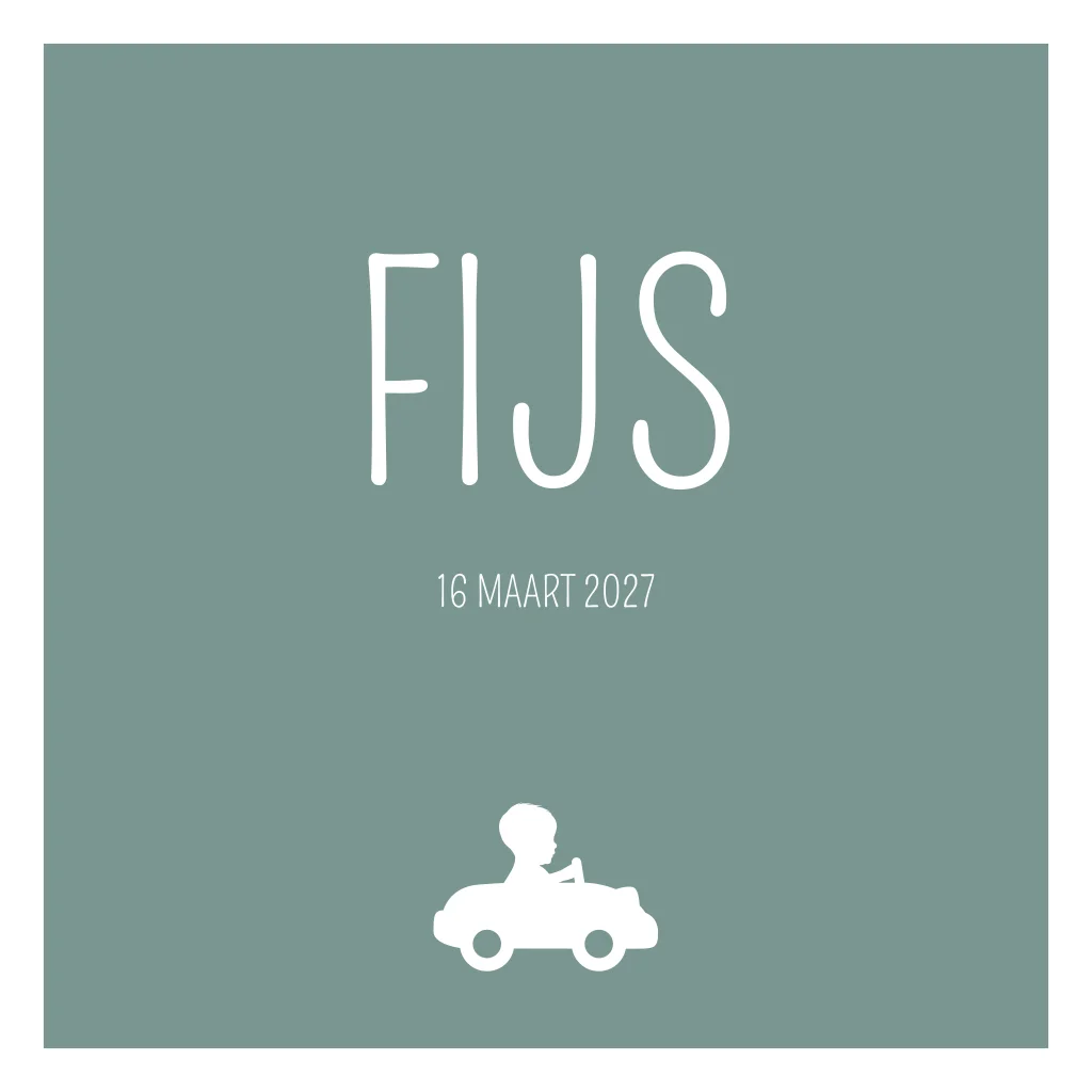 Oud groene geboortekaart met witte illustratie van een jongetje die in een auto rijdt. Verander de kleur en/of opmaak van geboortekaartje Fijs eenvoudig in onze editor. Je kunt ook kiezen uit andere illustraties of het geheel verwijderen.