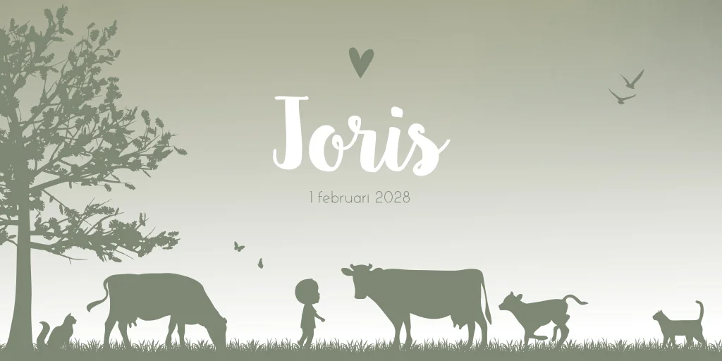 Prachtige illustratiekaart Joris. Op deze kaart zie je een kindje in een weiland met koeien staan, vlakbij de boerderij. Ook zie je 2 katten, vlinder, vogels en een boom. Je kunt zelf de kindjes kiezen in onze editor, zo ook de diertjes. Zo maak je de kaart helemaal eigen. Als je kindjes bepaalde hobby's hebben kun je dit ook op de kaart verwerken. Zoek je iets speciaals en zit het er niet tussen? Stuur ons een mailtje, dan gaan wij het voor je maken en in de editor zetten!
