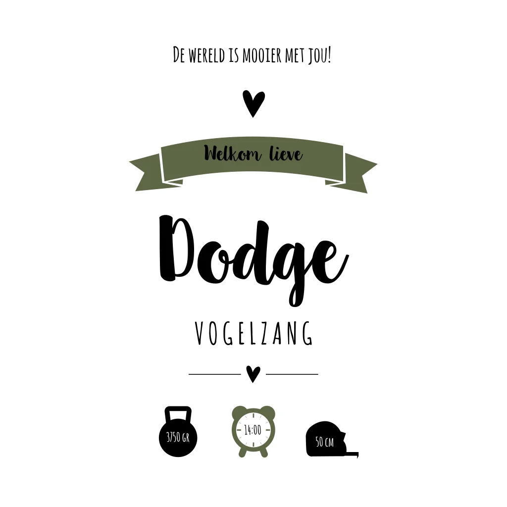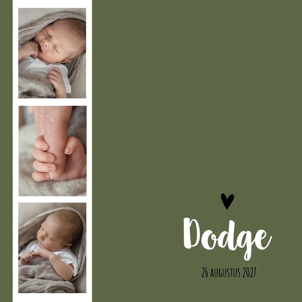 Een hip groen geboortekaartje met plek voor veel fotootjes van de kleine! Door de foto's op de kaart te drukken krijg je een speels effect. Kaartje Dodge is een stoer maar ook speels kaartje.