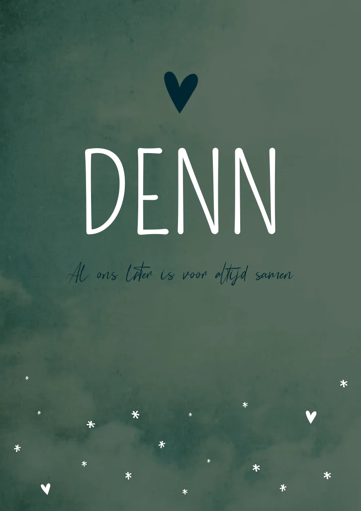Stoer gewolkt geboortekaartje in donkergroene trendkleur. Kaartje Denn is afgewerkt met goudfolie voor de naam en hartjes/sterretjes. Wil je graag een andere kleur? Neem dan een kijkje in onze editor voor alle opties!