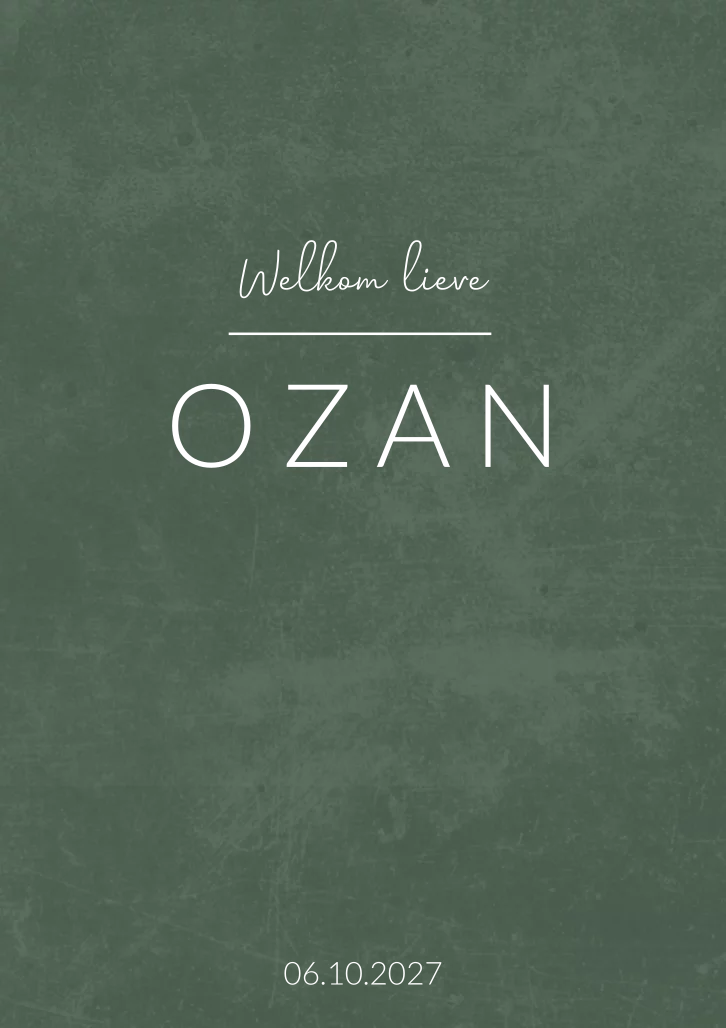 Een stoer groen geboortekaartje met goudfolie. Kaartje Ozan is een prachtige combi tussen strak en speels. Wil je het kaartje graag aanpassen? Neem dan een kijkje in onze editor voor alle mogelijkheden!