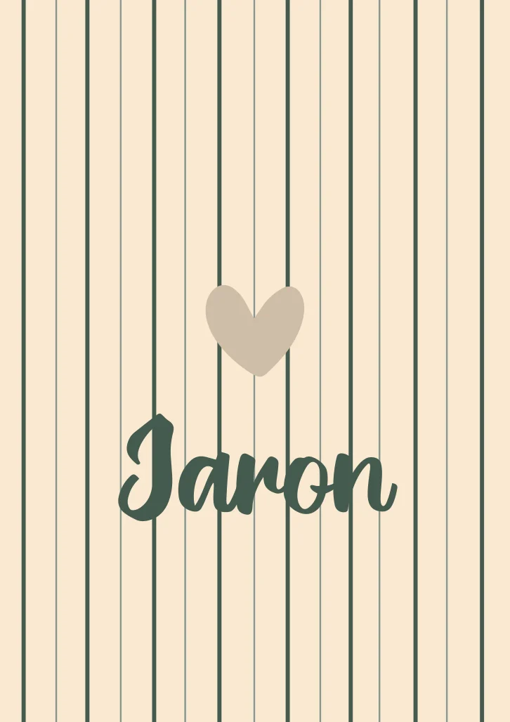 Een prachtig zacht geel met donkergroengestreept baby kaartje Jaron met een hartje.