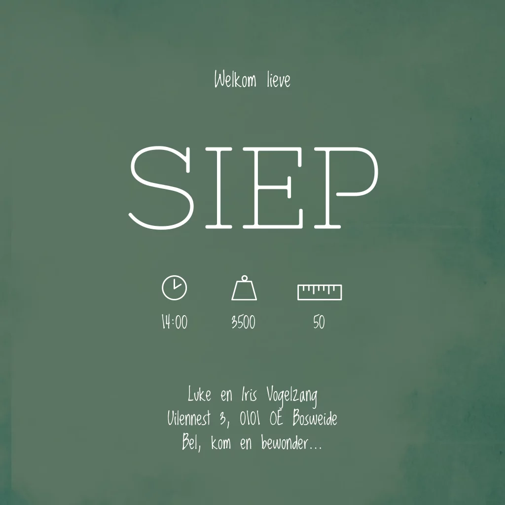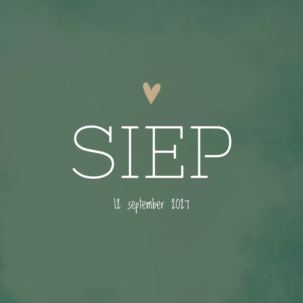 Een stoer donkergroen geboortekaartje met ook een lieve uitstraling. De bruine hartjes op kaartje Siep zijn ook prachtig met goudfolie. Bekijk alle opties in de editor.