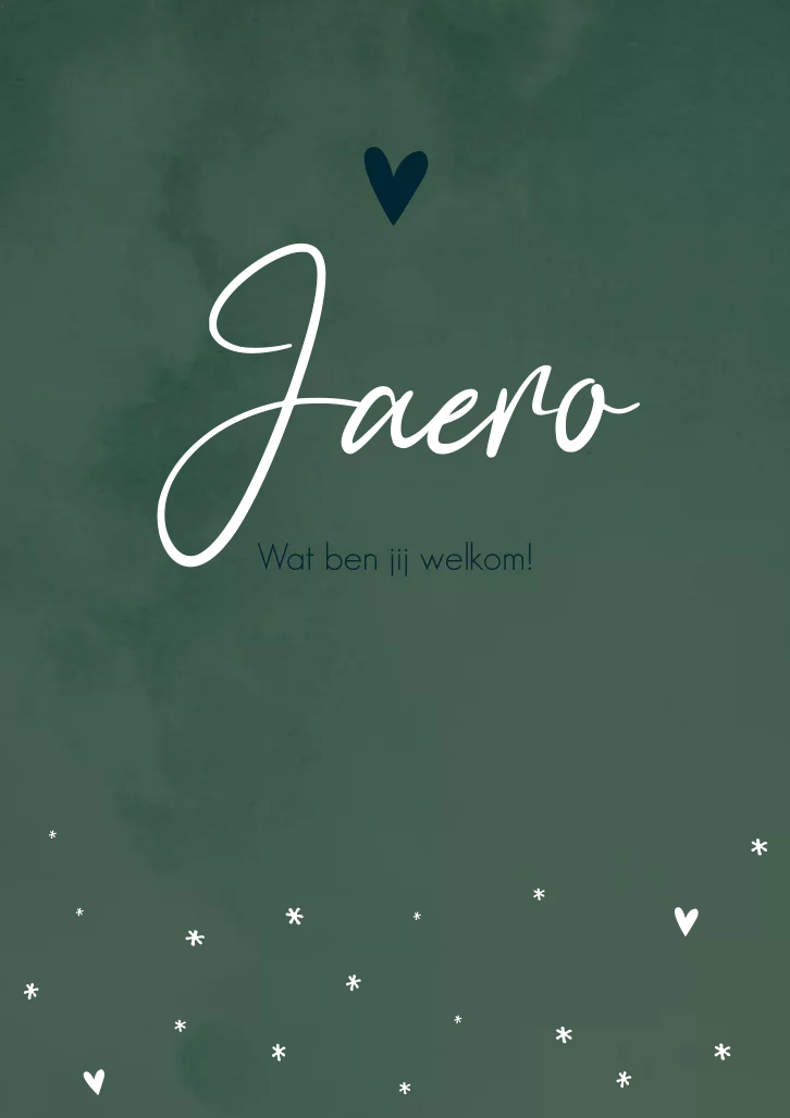 Een gewolkt donkergroen geboortekaartje met koperfolie voor de naam en hartjes/sterretjes. Kaartje Jaero is een lief en romantisch kaartje.