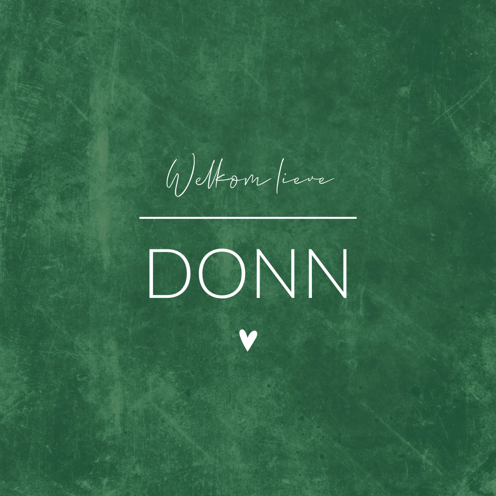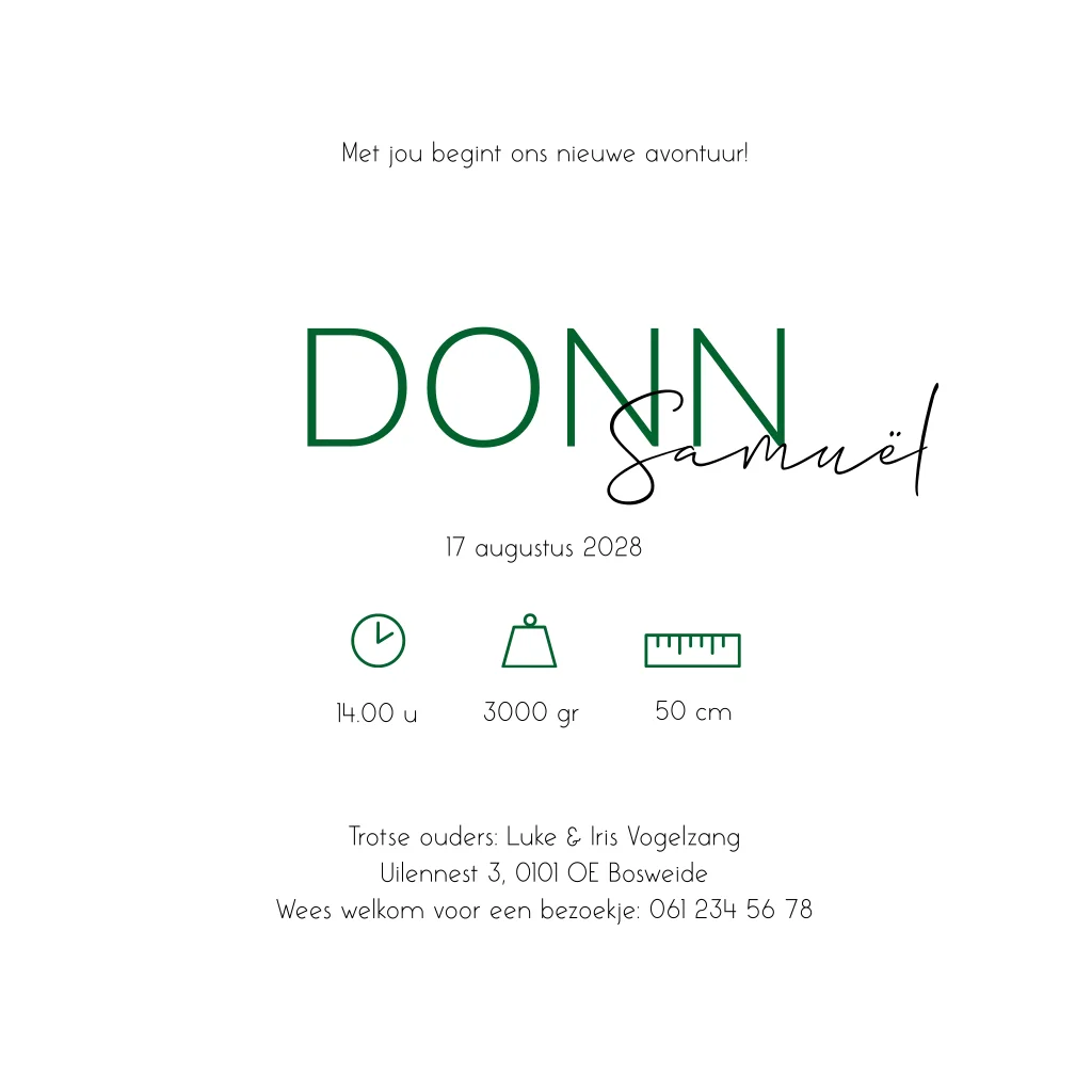 Super stoer groen geboortekaartje Donn met goudfolie. Je kunt de kaart helemaal zelf aanpassen naar hoe je het mooi vindt. Ook de icoontjes kun je aanpassen of verwijderen. We helpen je graag als je vragen hebt!