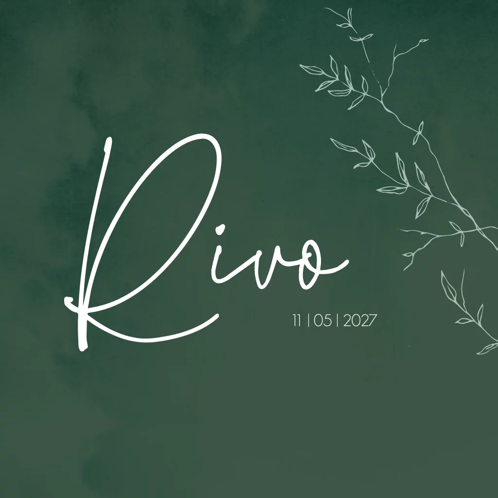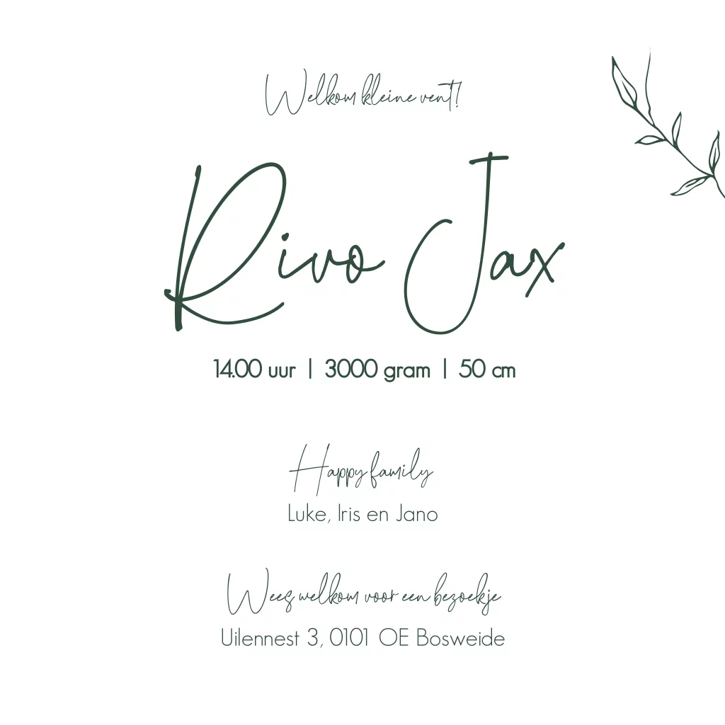 Stoer donkergroen gewolkt geboortekaartje Rivo met botanische takjes, sierlijke witte letters en een witte binnenzijde met groene letters. Alle kleuren zijn aanpasbaar, zo ook de opmaak en de afbeeldingen.