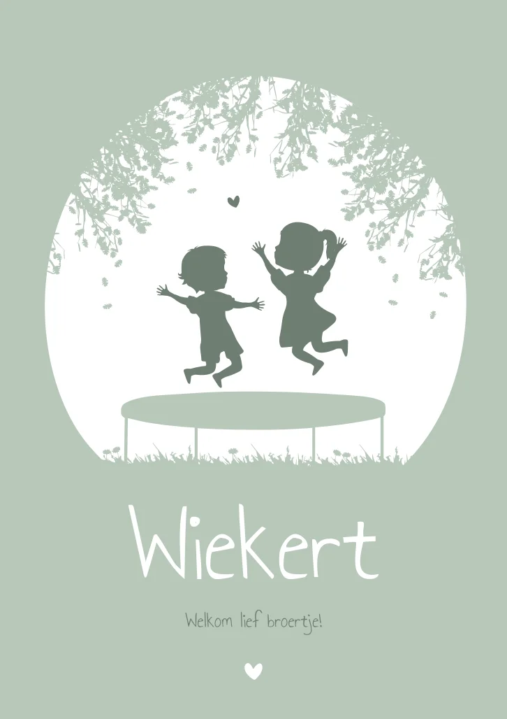 Een vrolijk geboortekaartje van twee kindjes die springen op de trampoline. Op kaartje Wiekert zie je het kleine broertje met zijn grote zus omringd door bloemetjes, bomen en vallende blaadjes. Wil je graag iets aanpassen? Neem dan een kijkje in onze editor voor de vele opties!