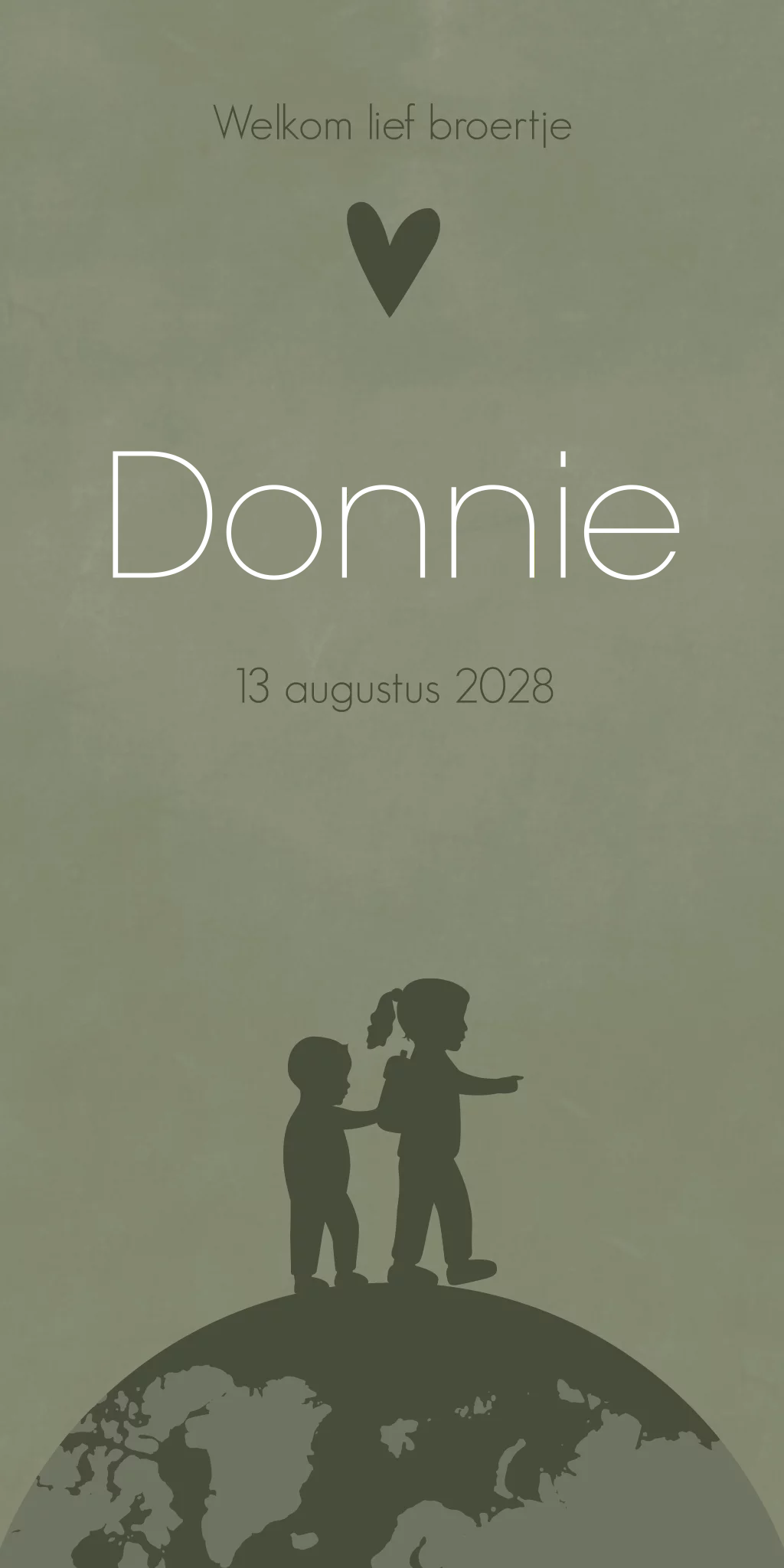 Een stoer groen geboortekaartje met een wereldbol/aarde/globe met grote zus en haar broertje met een rugzak, die op ontdekkingstocht gaan. Geboortekaartje Donnie is een strak kaartje met goudfolie.