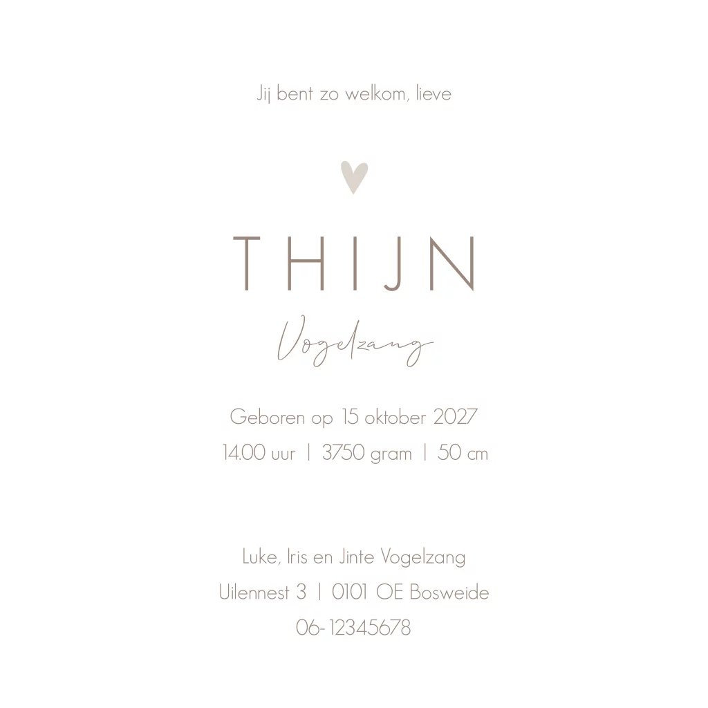 Het Uilennestje x Happy Horse. Een lief beige geïllustreerd geboortekaartje van een grote zus met broertje met als toevoeging een Happy Horse knuffel. Wil je graag iets aanpassen aan geboortekaartje Thijn? Neem dan een kijkje in onze beeldbank voor alle opties. Mis je nog iets? Neem dan contact met ons op en we helpen je graag verder!
