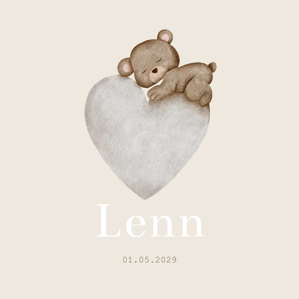 Lief, zacht en neutraal beige/crème geboortekaartje met een slapend teddy beertje op een watercolor hartje. Op geboortekaartje Lenn kun je de illustratie aanpassen naar jouw wensen. In de beeldbank vind je veel mooie tekeningen waar je uit kunt kiezen. Wil je dit geboortekaartje liever in een ander kleur? Pas de kleur naar eigen wens aan in de editor.