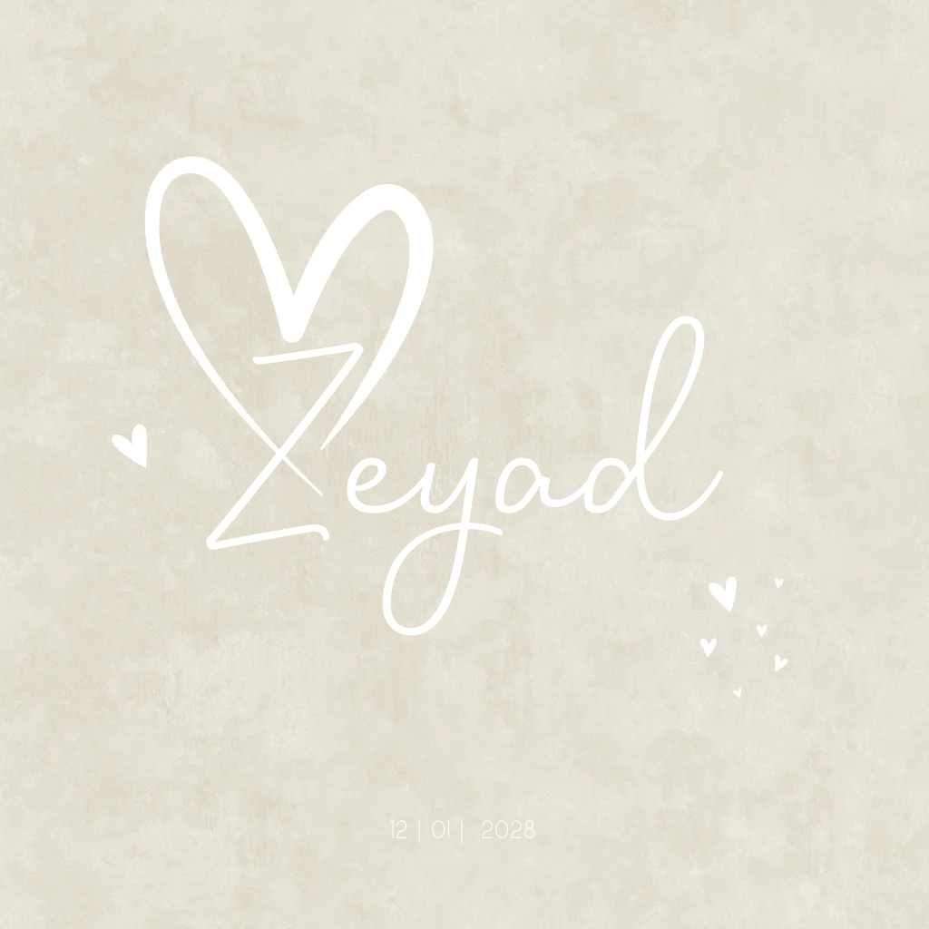 Velvet look beige/ crème geboorte kaartje Zeyad met witte hartjes en koperfolie letters. Wil je liever zilverfolie of goudfolie, je kunt dit kaartje zelf aanpassen! Bekijk de verschillende opties in de editor!