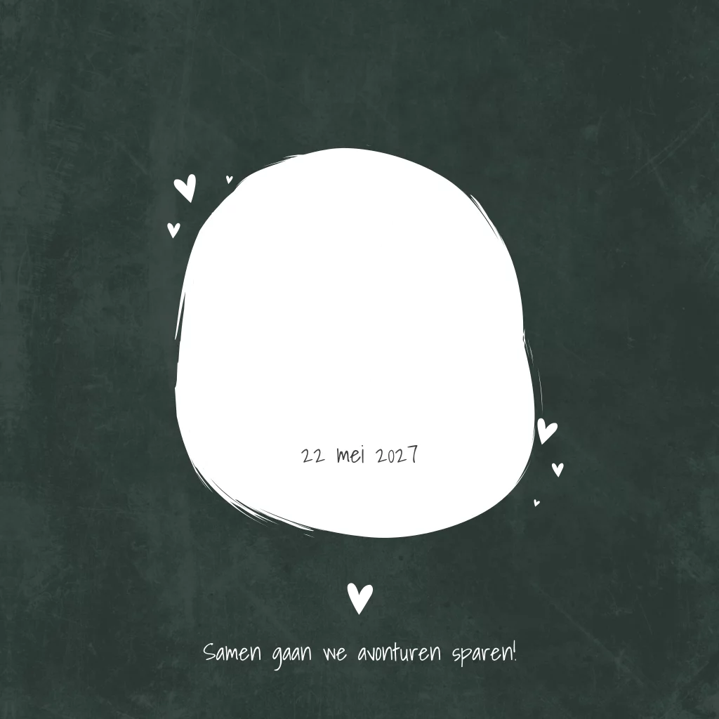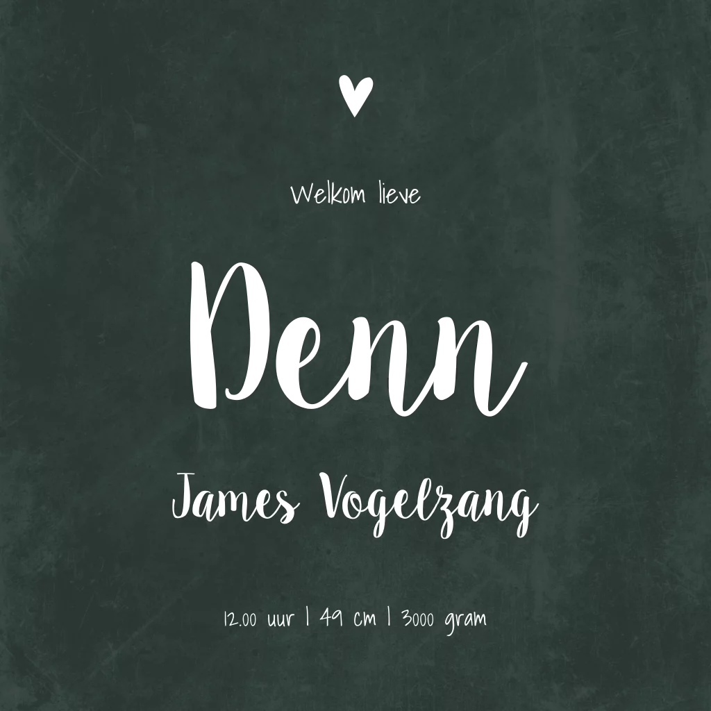 Donkergroen gewolkt geboortekaartje met hartjes. Geboortekaartje Denn is een lief en stoer geboortekaartje voor een jongen. Maak het helemaal af met goudfolie voor de naam en een aantal hartjes.