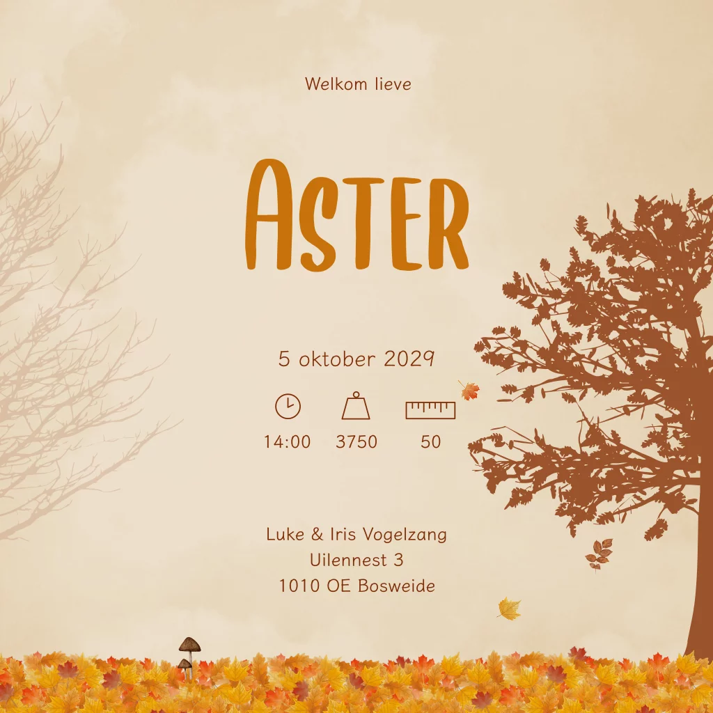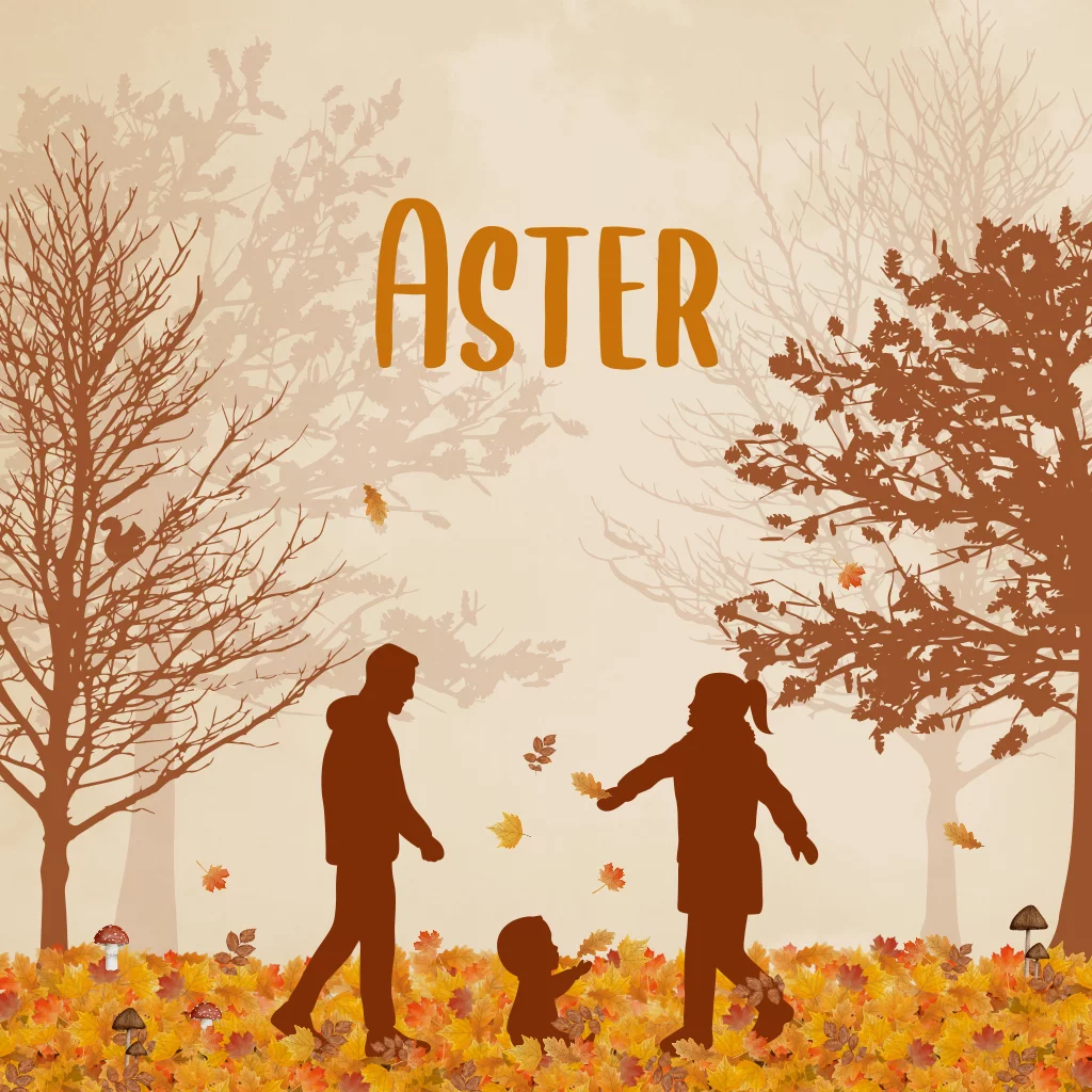 Een beige kaartje in herfst thema! Op kaartje Aster is een gezin te zien dat met blaadjes aan het gooien is in het bos. Tussen de herfstbladeren staan paddenstoelen en mooie bomen. Je past de kleuren en de gezinssamenstelling gemakkelijk aan in de editor.