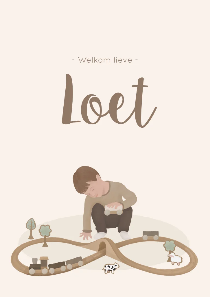 Een schattig geboortekaartje waarop een jongetje met zijn houten treinbaan aan het spelen is, met bijbehorende bomen, schaap en koe. Alle elementen zijn te verplaatsen of te verwijderen.