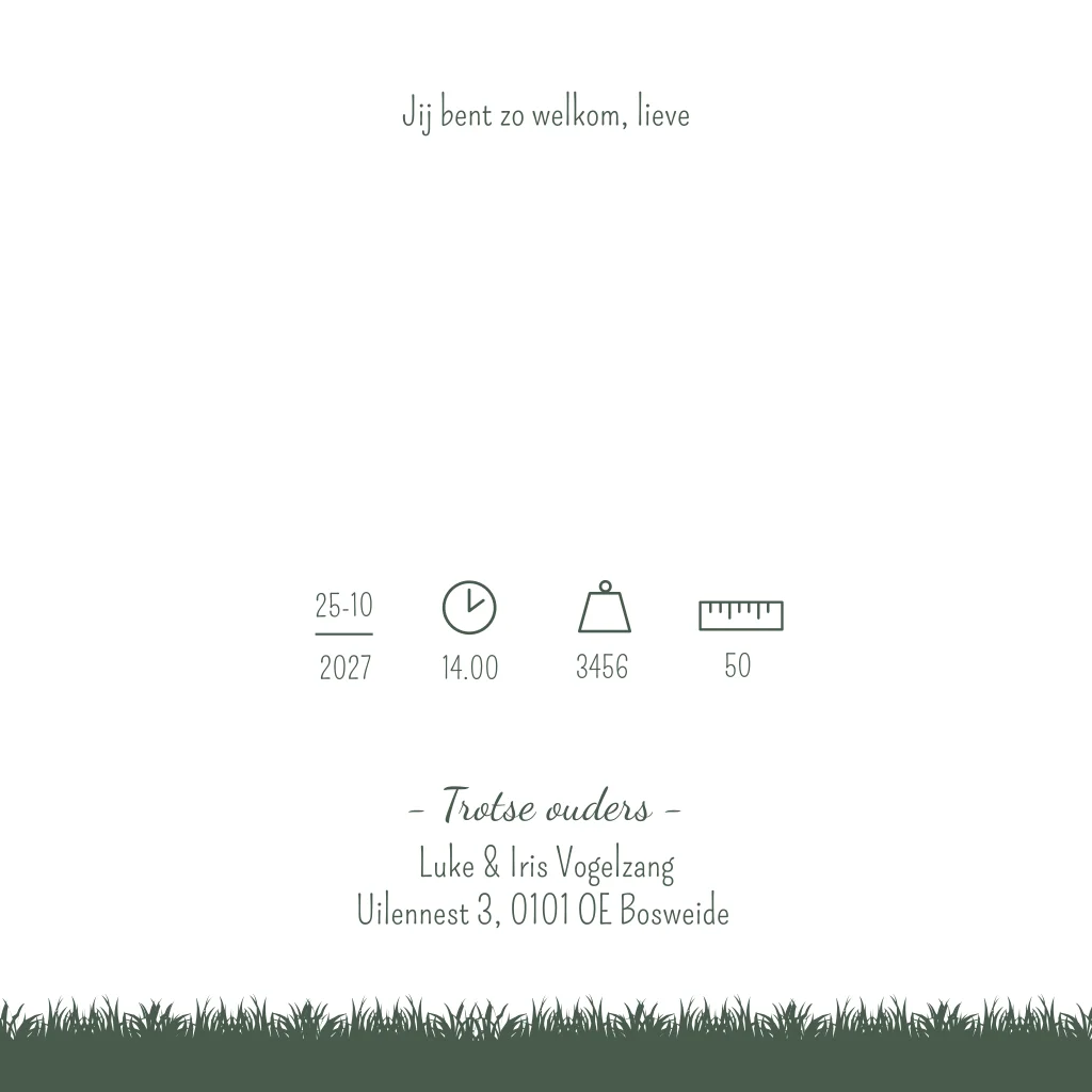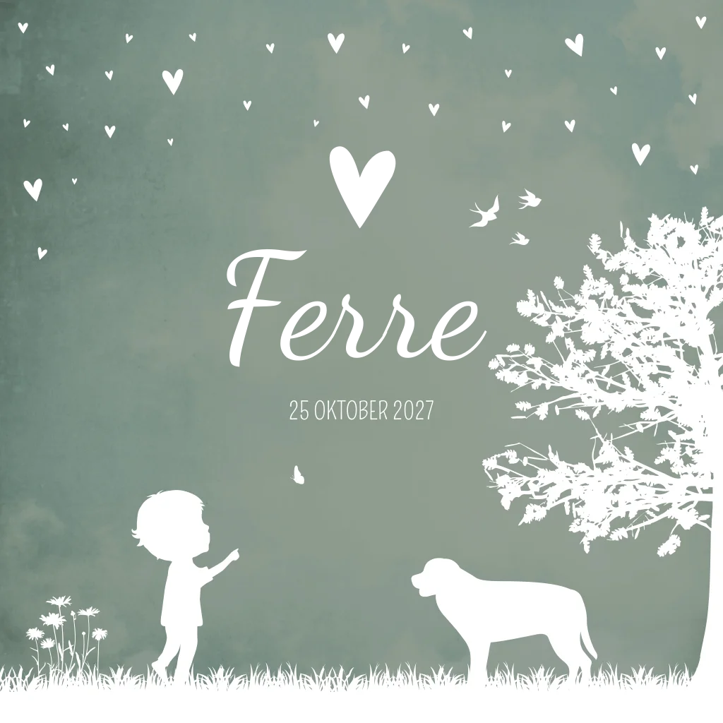 Een groengrijs geboortekaartje met een jongetje dat wijst naar zijn naam/ de vogeltjes. Onder de boom staat een hondje. Geboortekaartje Ferre is een illustratie kaartje waarbij je de illustraties eenvoudig zelf kunt aanpassen in de editor. Zo kan je bijvoorbeeld extra dieren toevoegen of de hond vervangen voor een ander dier. Kom je er zelf niet uit? Neem gerust contact met ons op, we helpen je graag.