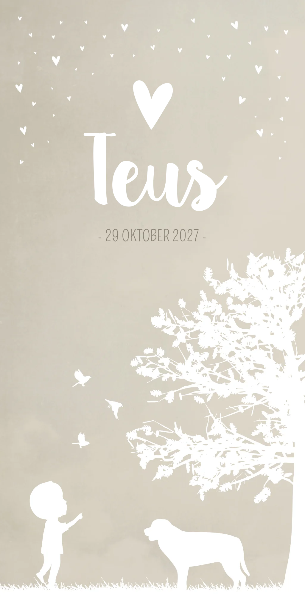 Een beige/ crème gewolkt geboortekaartje met een boom, hartjes hondje en een jongetje dat wijst naar de vogeltjes. Kaartje Teus is een romantisch kaartje wat extra speciaal wordt als je de naam laat drukken in koperfolie. Heb jij een andere gezinssituatie? Pas het kaartje dan gemakkelijk aan in onze editor!