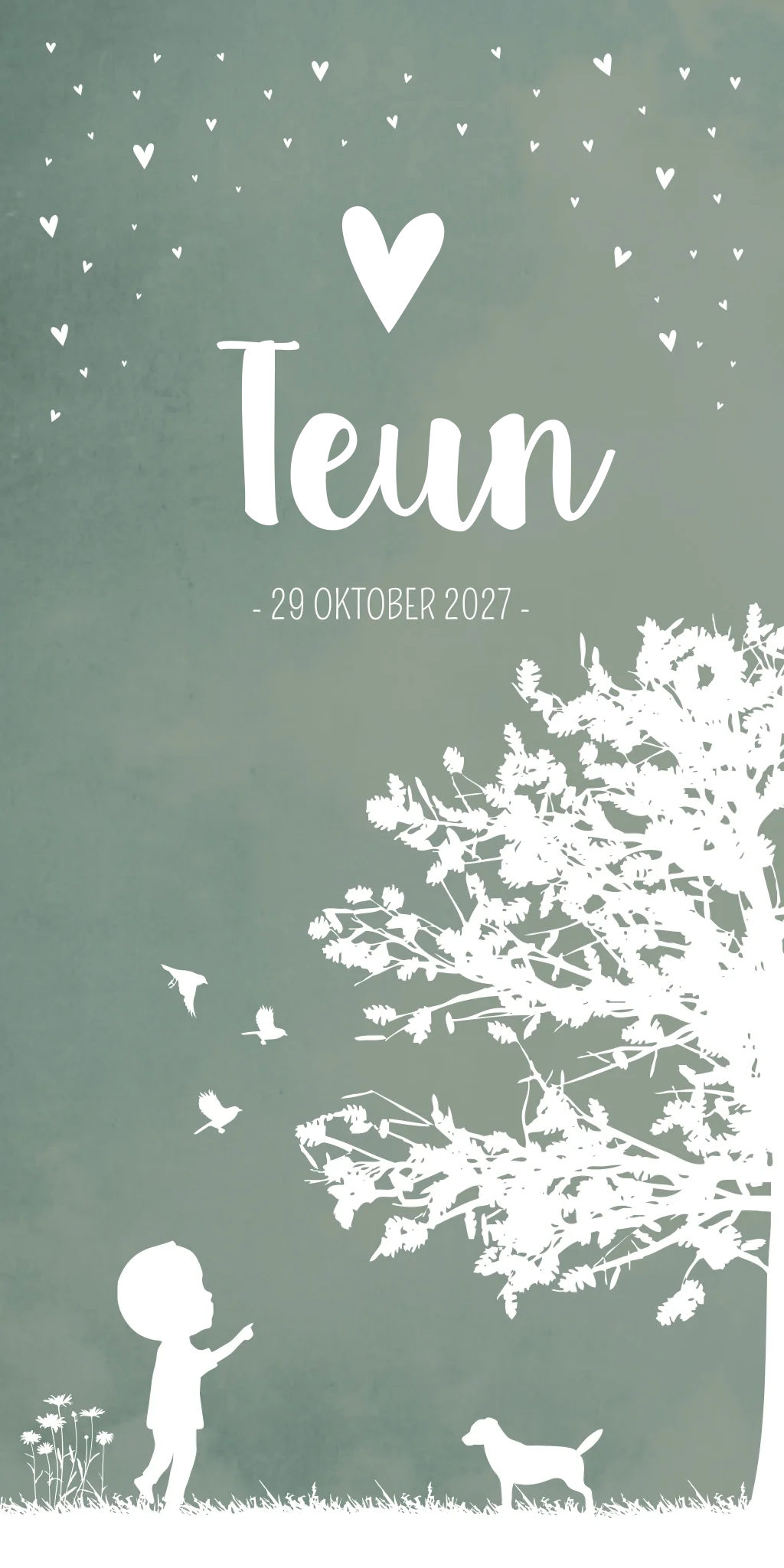 Een groen gewolkt geboortekaartje met een boom, hartjes hondje en een jongetje dat wijst naar de vogeltjes. Kaartje Teun is een romantisch kaartje wat extra speciaal wordt als je de naam laat drukken in koperfolie. Heb jij een andere gezinssituatie? Pas het kaartje dan gemakkelijk aan in onze editor!