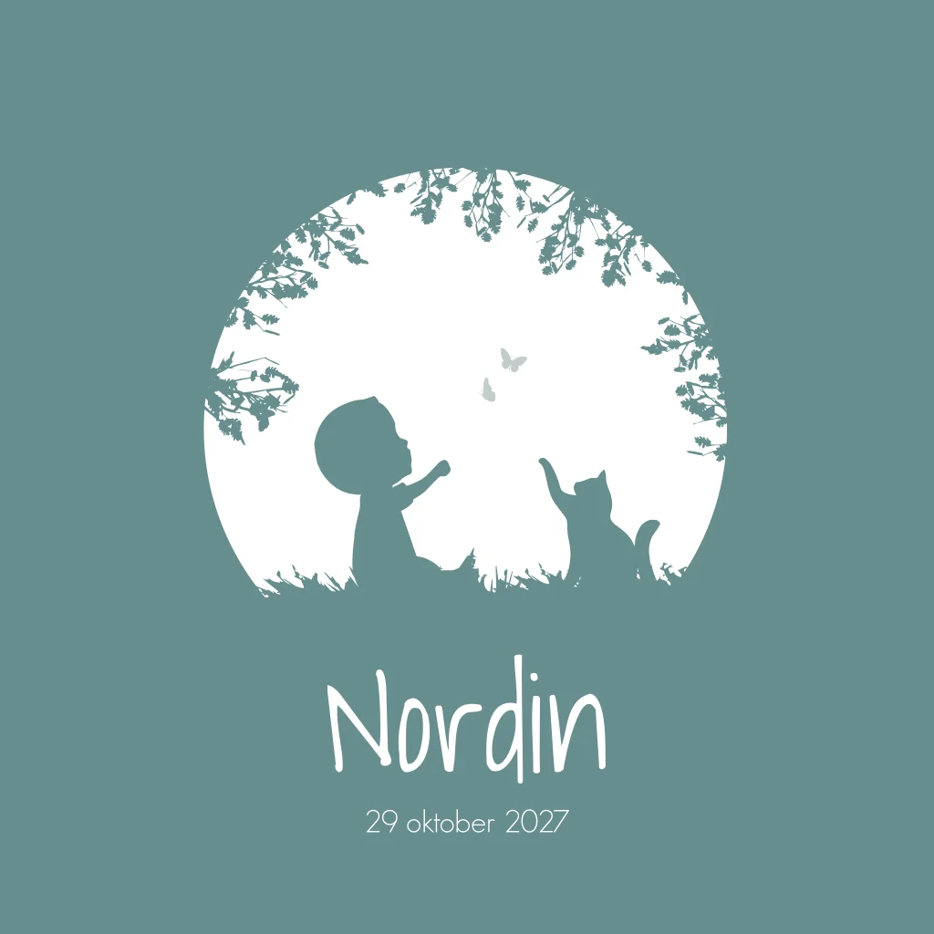 Een lief blauw/groen geboortekaartje met een jongetje en zijn kat die samen spelen in het gras met vlindertjes. Wil je graag op kaartje Nordin een ander huisdier? Neem dan een kijkje in onze editor voor alle opties.