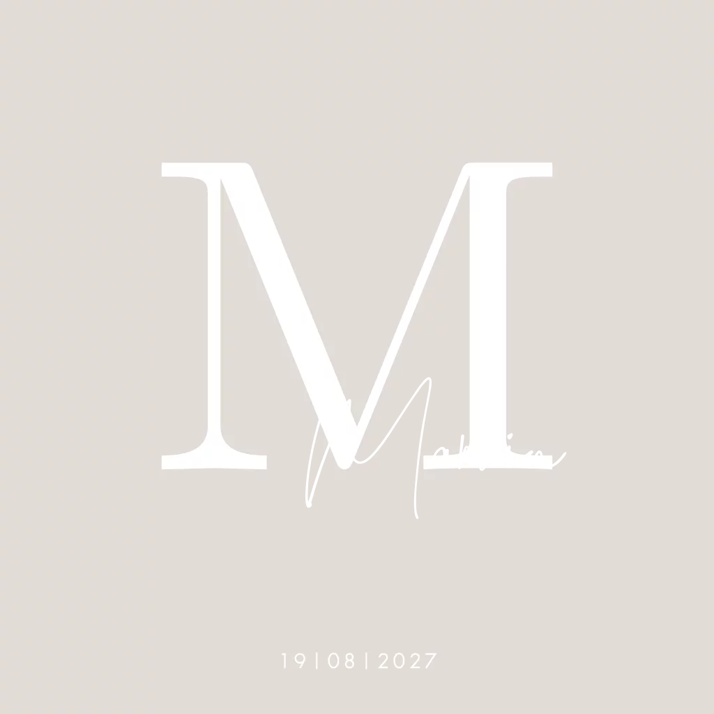Een beige hip geboortekaartje met een witte letter als initiaal. De naam staat in een sierlijke handgeschreven letter in goudfolie. Kaartje Marvin is klassiek en tijdloos.