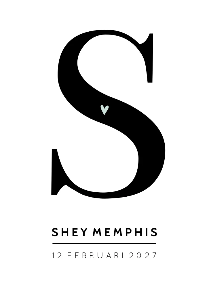 Een modern kaartje met een witte achtergrond en een grote letter op de voorzijde. Op kaartje Shey staat een lichtblauw hartje in het initiaal. Wil je het kaartje graag aanpassen, neem dan een kijkje in onze editor voor alle opties.