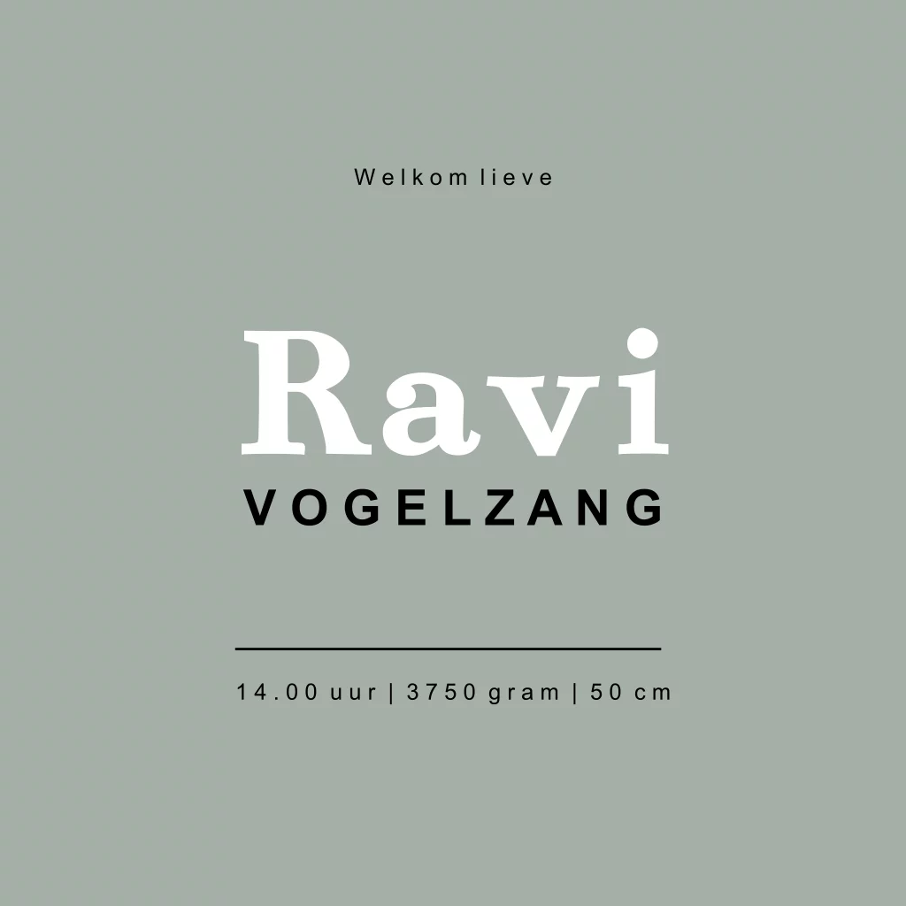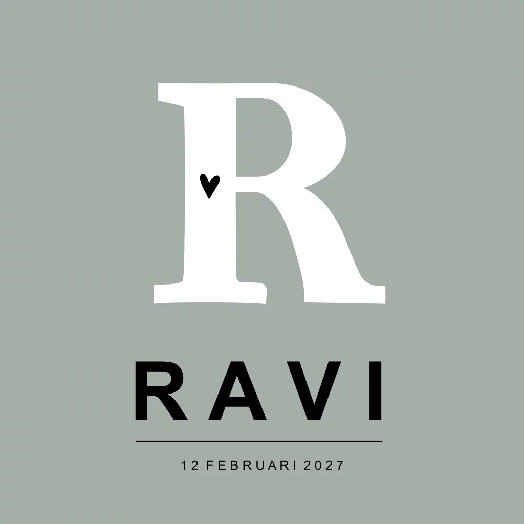 Een strak, stoer geboortekaartje met een grote witte letter als initiaal en een grijsgroene achtergrondkleur. Om kaartje Ravi een lieve touch te geven staat er een hartje op de kaart.