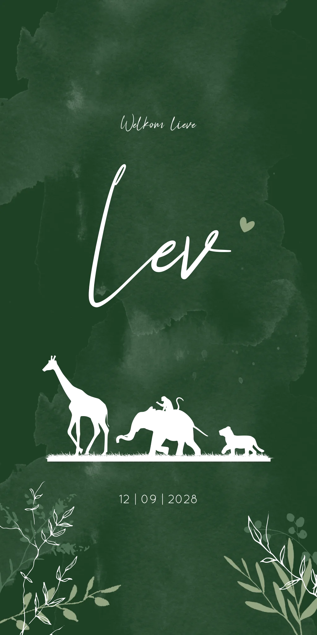 Een illustratief warm donker groen geboortekaartje met een silhouet tekening van een giraffe, olifantje en leeuwtje. De kaart heeft witte vlekken wat het een stoer kaartje maakt. De takjes en groene kleuren en goudfolie zorgt voor een speels effect.